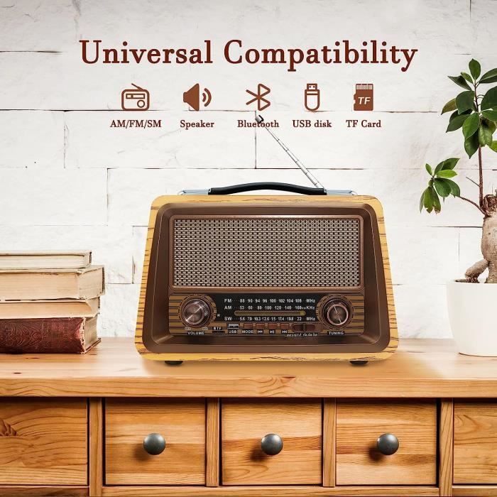 La petite radio rétro imperméable avec support pour téléphone portable protège contre la pluie et les éclaboussures. Radio Rétro Portable, avec AM/FM/SW, avec 1200 mAh Batterie Énergie solaire et charge USB : la radio solaire rétro efficace se recharge en 2 heures via panneau solaire ou USB-C Cette petite radio rétro polyvalente offre une alimentation de secours lors des excursions en plein air. Radio Rétro Portable AM/FM/SW Rétro Radio Portable, Avec Batterie Rechargeable De 1200 MAh Radio AM FM SW La construction robuste de cette radio solaire Bluetooth de café ne pèse que 550 g pour une mobilité confortable., 2., Support de téléphone portable intégré et robustesse : la radio portable pratique avec support pour téléphone portable fixe les smartphones jusqu'à 6,7 en toute sécurité grâce au support pliable rembourré en silicone pour un fonctionnement horizontal et vertical. La radio solaire Bluetooth Coffee durable utilise un matériau résistant aux chocs pour une utilisation en extérieur., 3., Qualité sonore et design haut de gamme : le haut-parleur rétro immersif produit des basses riches grâce à un boîtier optimisé pour une résonance optimisée pour un son immersif. Haut-parleur Intégré Magnétophone Cassette Vintage Lychee - Radio AM/FM... Les boutons de réglage sont beaucoup plus intuitifs que les boutons déroutants des radios numériques, aussi faciles à comprendre que les radios des années précédentes, même les personnes âgées peuvent les utiliser facilement. Caractéristiques intelligentes : la petite radio rétro offre Bluetooth, lecteur de carte USB/TF et bandes FM/AM/SW dans un format compact de radio de cuisine. Caractéristiques intelligentes : la petite radio rétro offre Bluetooth, lecteur de carte USB/TF et bandes FM/AM/SW dans un format compact de radio de cuisine. Radio rétro AM/FM/SW avec Bluetooth 5.0, petite radio... Matériel: ABS Dimensions : 170 x 105 x 90 mm Options de charge : solaire et USB-C Contenu de l'emballage : 1 petite radio rétro. Le design vintage élégant de cette petite radio rétro combine style et fonctionnalité., La technologie Bluetooth 5., 3 de cette radio portable avec support de téléphone portable garantit une transmission sans fil stable. Le support de téléphone portable intégré et l'indicateur de charge assurent un confort pratique. Particularités : 1., Alimentation et mobilité multifonctions : cette radio rétro efficace de petite taille se recharge complètement en 2 heures via panneau solaire ou USB-C et fournit une alimentation de secours lors des excursions en plein air. Facile à transporter : cette petite radio rétro avec batterie est compacte (taille : 170 x 105 x 90 mm) et est livrée avec une poignée pour que vous puissiez la transporter partout.