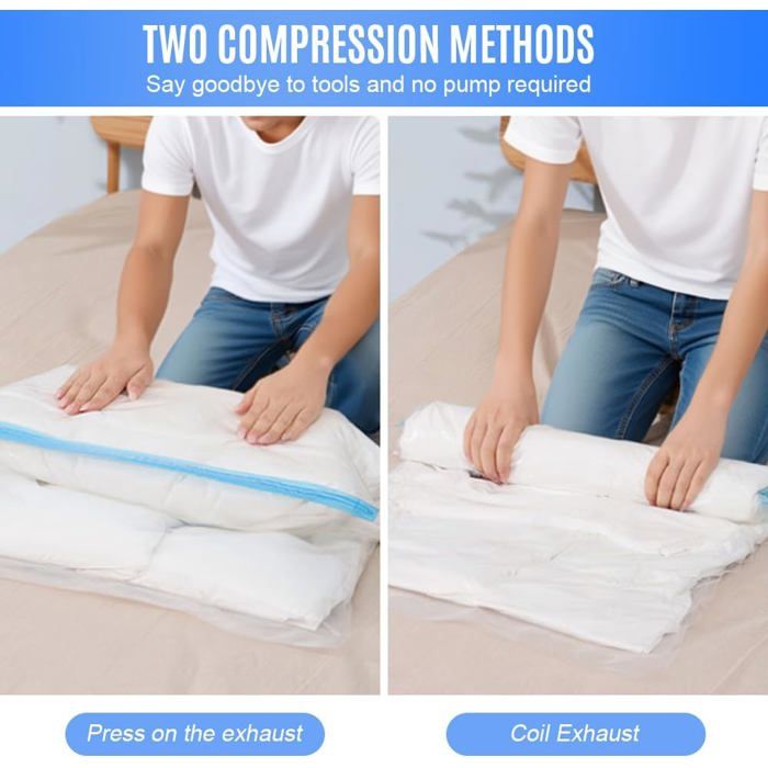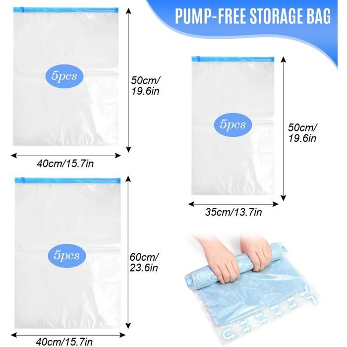 MATÉRIAU DE HAUTE QUALITÉ : Les sacs sous vide pour vêtements sont fabriqués à partir d'un mélange de PET et de PE de haute qualité, ce qui permet de maintenir l'étanchéité pendant longtemps et peut être utilisé pour une variété d'emballages tels que le stockage, les voyages ou les déménagements. pas besoin de pompe à main ou d'aspirateur. Le sac de voyage est facile à transporter et permet d'économiser de l'espace dans votre valise. CONTENU DU PAQUET : Le paquet contient 15 sacs sous vide, 5 de chaque taille, la taille est petite : 35x50 cm, moyenne : 40x50 cm, grande : 40x60 cm, vous pouvez les utiliser pour différentes tailles d'articles stockés dans les armoires ou d'autres fournitures, peut transporter différentes saisons de vêtements, un outil idéal pour le stockage, les voyages et les déménagements. Sac sous vide aspirateur housse de rangement sous vide Ils compriment les articles pour gagner de la place, garder votre valise ou votre garde-robe organisée et mieux utiliser l'espace. Lors de l'utilisation, veuillez appuyer fermement sur le clip pour éviter qu'il ne bouge. Sacs de Rangement Sous Vide Vêtements Aspirateur 6 Pièces 70x50cm Sac... Ils sont idéaux pour ranger les couettes, les oreillers, les draps, les vêtements, les couvertures, les serviettes, les coussins, les jouets et d'autres articles. Spécifications : Matériau : PET et PE Couleur : transparent Nos sacs sous vide peu encombrants conviennent au rangement des vêtements, couvertures et autres. Placez simplement vos articles dans le sac sous vide et enroulez manuellement le sac pour expulser l'air. Rangement Vêtements Compressible Sacs Rangement Sous Vide Aspirateur, 9 Pièces Vacuum Storage Bags Sac Sac Sous Vide Vetement Housse de rangeent sous vide | Coparatif 2023 Guide d'achat LARGE APPLICATION : Tous les articles peuvent être rangés dans votre valise ou dans n'importe quel espace de rangement que vous souhaitez utiliser après les avoir emballés dans le sac de rangement sous vide pour vêtements, idéal pour les déménagements, les voyages et le rangement.