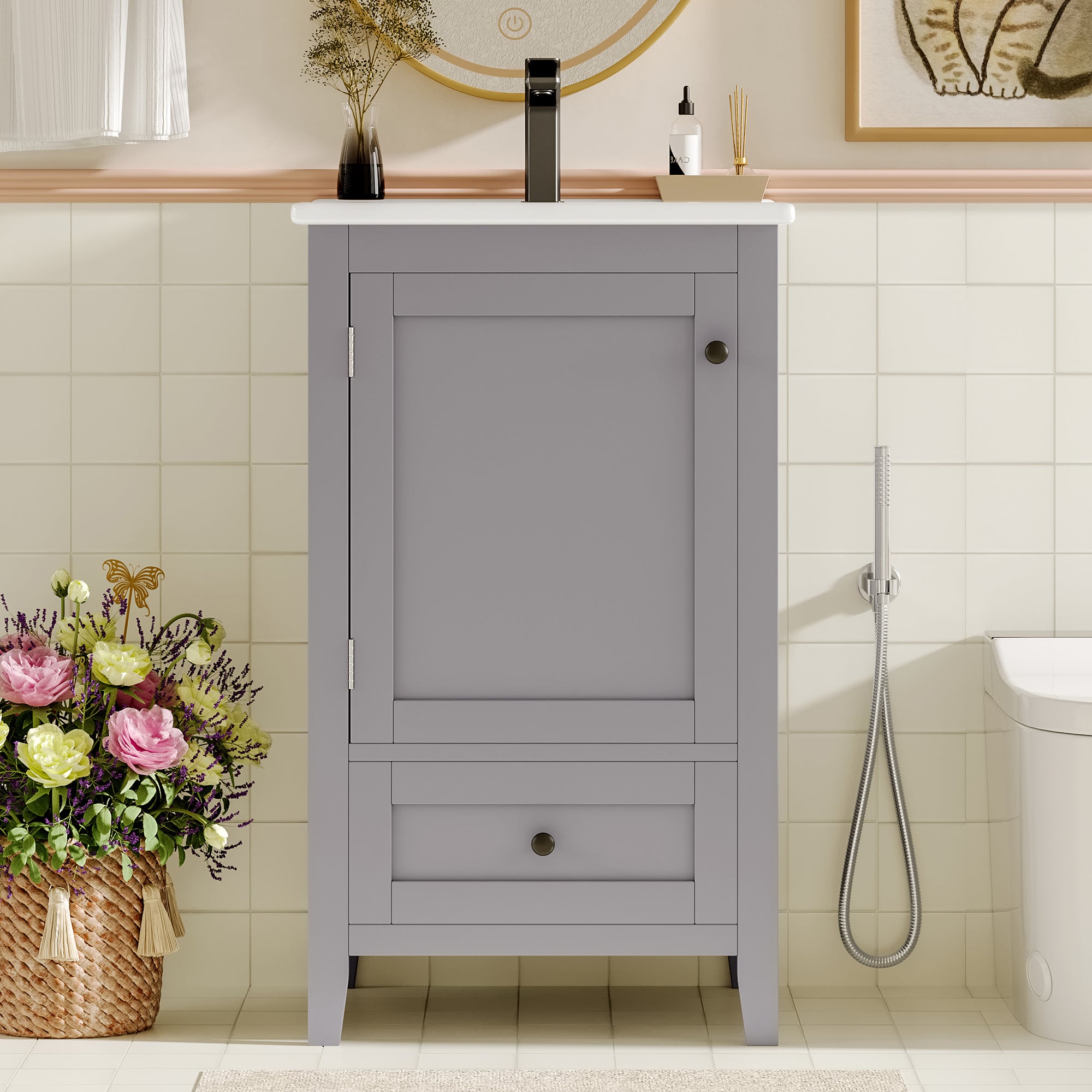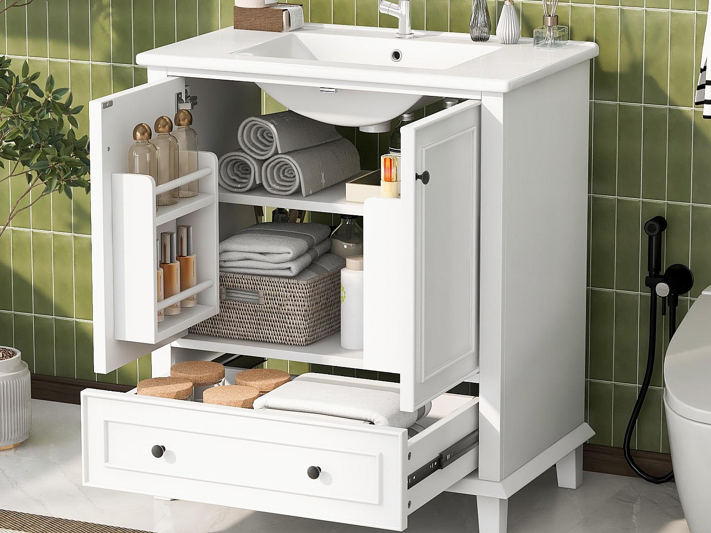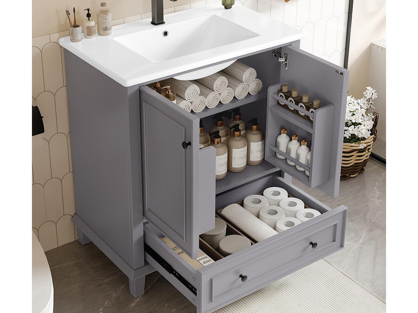 Ensemble Meuble simple vasque 80cm 2 niches et colonne Teren Bois Serviettes, articles de toilette ou autres petits objets peuvent être rangés sous le meuble, pour une salle de bain propre et bien rangée. Meuble Salle De Bain Moderne Poignée Dor Meuble De Salle De Bain Sur Pied - Avec Une Vasque En Céramique - 1 Porte Et 1 Tiroir - Blanc Meuble Rangement Salle Bain 2 Portes Le design creux sous le meuble est pratique pour ranger de petits objets. Meuble sous-vasque 3 tiroirs MARBELLA 80 cm vasque miroir / Décor... Meuble vasque - meuble sous-vasque - 2 portes rainurées avec étagère... Aucune étape d'installation compliquée n'est requise ; il suffit de l'installer. Des poignées élégantes et de beaux panneaux soulignent son design réussi. Déplacer le meuble est également un jeu d'enfant. Sa grande dureté le rend robuste et résistant aux rayures, et il offre également une excellente résistance à la chaleur. Ce meuble de salle de bain a été conçu avec une grande attention aux détails, avec des poignées uniques et de beaux panneaux qui en font le point fort de la salle de bain. Le lavabo en céramique est facile à nettoyer et à entretenir, sa surface brillante et sa durabilité.