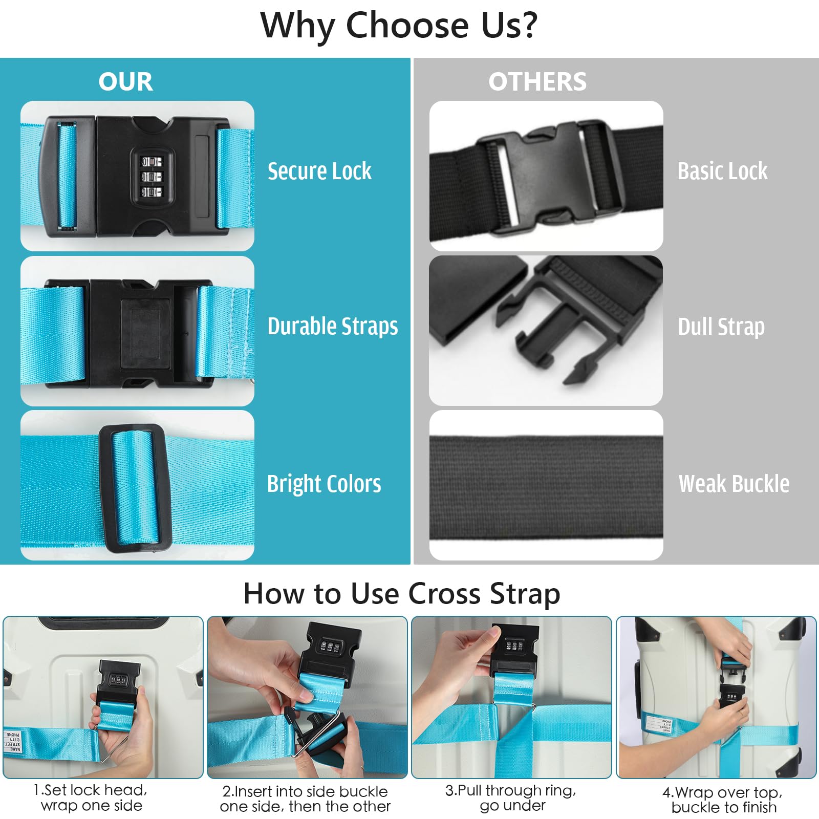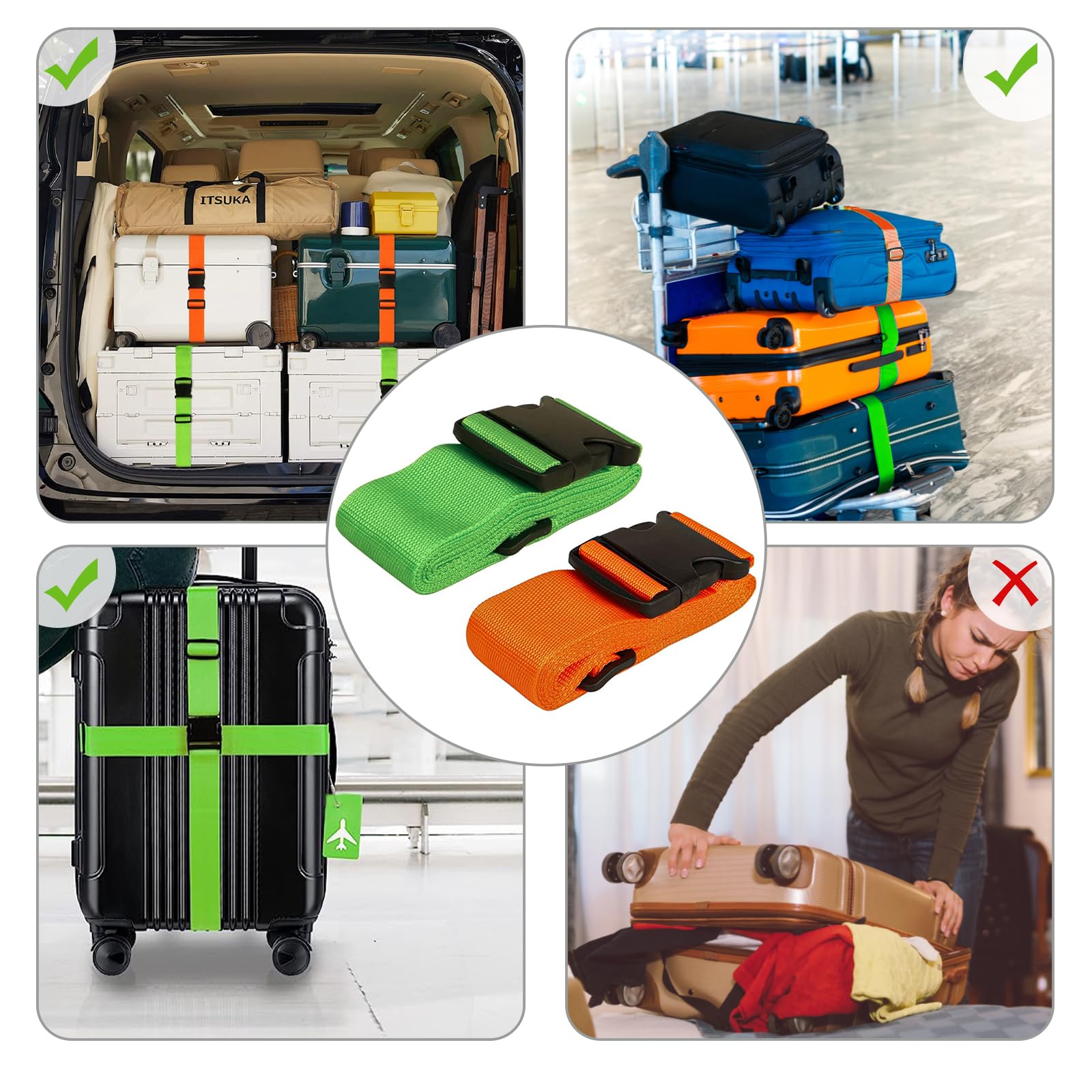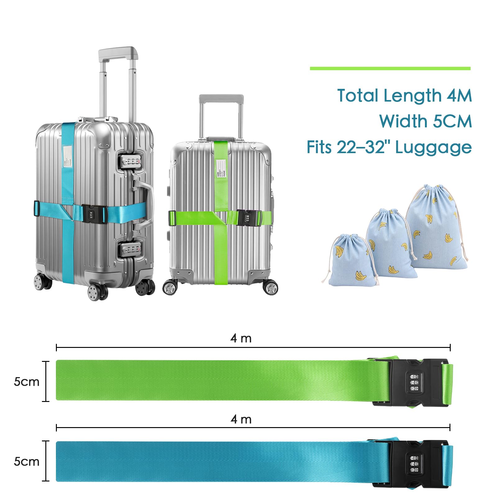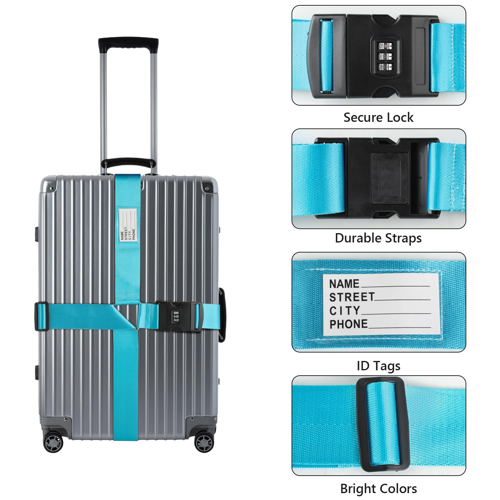Sangle pour Valise avec Code 3 Chiffres Grise et Bleue (En Croix Sangle Polyester Robuste Valise 22 32 Pouces Voyage Sangle Valise - Sangle Valise Voyage - Ceinture Valise - Sangles Sangle Valise Cadenas à Code Lot de 4 sangles de bagage pour valises approuvées par la TSA – Vert fluo – Ceintures en nylon de qualité supérieure pour valise, porte-documents et sac de voyage – Longueur de la sangle réglable de 1 Matériau robuste: Les sangles de bagage sont en polyester résistant avec boucle solide, garantissant une fixation sûre lors du transport. Housse pour valise,Sangles de sécurité détachables pour bagages de... Usage polyvalent: Convient pour sécuriser bagages, sacs à dos, chariots ou équipements de plein air comme tentes et sacs de couchage, pour diverses situations de voyage. Design visible: Les sangles pour valise ont des couleurs vives et une étiquette nominative, facilitant l’identification rapide des valises et sacs de voyage.