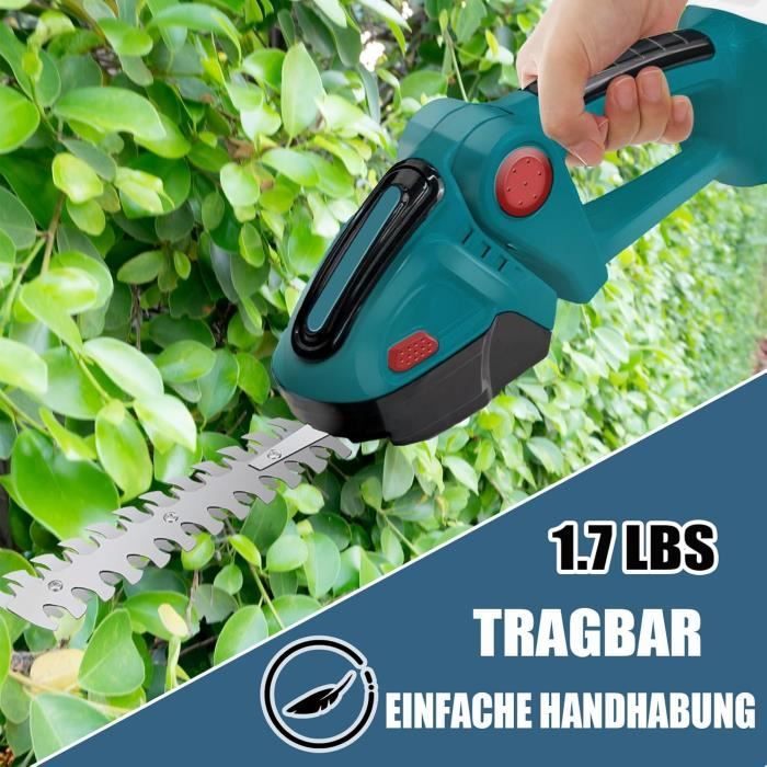 Cisaille Sculpte-Haie et Taille-Herbes sans Fil 3.6V, Cisaille à Gazon avec 2 Lames- USB Charge Le taille-haie peut être complètement chargé en 3-5 heures et peut fonctionner n'importe où pendant environ 60 minutes. Taille-haie Batterie 24V 1.5Ah Taille-haie Sans Fil, 2 En 1 Taille-Herbes Avec 2 * 1.5Ah 24V Mini Taille Haie Sans Fil La lame de taille-haie est conçue pour manipuler facilement les branches et les feuilles plus épaisses, vous permettant de sculpter vos buissons dans la forme ou la taille souhaitée. COSTWAY Cisaille à Gazon sans Fil 3,6 V avec 2 Lames, Taille Herbe Électrique 2 en 1 avec... Taille Haie sans Fil, 7,2V Taille-Haie et Cisaille a Gazon 2 en 1, Taille Haie Batterie 1,5Ah... En appuyant sur les boutons ronds des deux côtés et en faisant tourner la tête de la lame, vous pouvez facilement ajuster l'angle pour tailler précisément la haie sous différents angles. La conception sans fil simplifie le travail à l'avant et à l'arrière, pour l'élagage des petits arbres, des branches terminer le travail d'élagage en toute simplicité. 🌿【Double Interrupteur de Sécurité】Le taille haie est équipé d'un interrupteur de verrouillage de sécurité, qui nécessite d'appuyer simultanément sur le bouton d'alimentation et le bouton de sécurité pour démarrer, vous protégeant ainsi des blessures accidentelles. La lame à gazon de 4 pouces de large est conçue pour couper l'herbe ou de petites parcelles de pelouse, et son bord tranchant assure une coupe nette et soignée à chaque fois. 🌿【Tête Réglable de Manière Flexible à 90 °】Le taille haie electrique est doté d'une tête de travail réglable, qui peut être utilisée de manière flexible à un angle de 90 ° pour répondre à divers besoins. 🌿【Ciseaux à Gazon et Taille-arbustes 2 en 1】 Notre taille-haie sur perche sans fil est équipé de deux lames interchangeables (largeur/longueur de coupe 10 cm/20 cm).