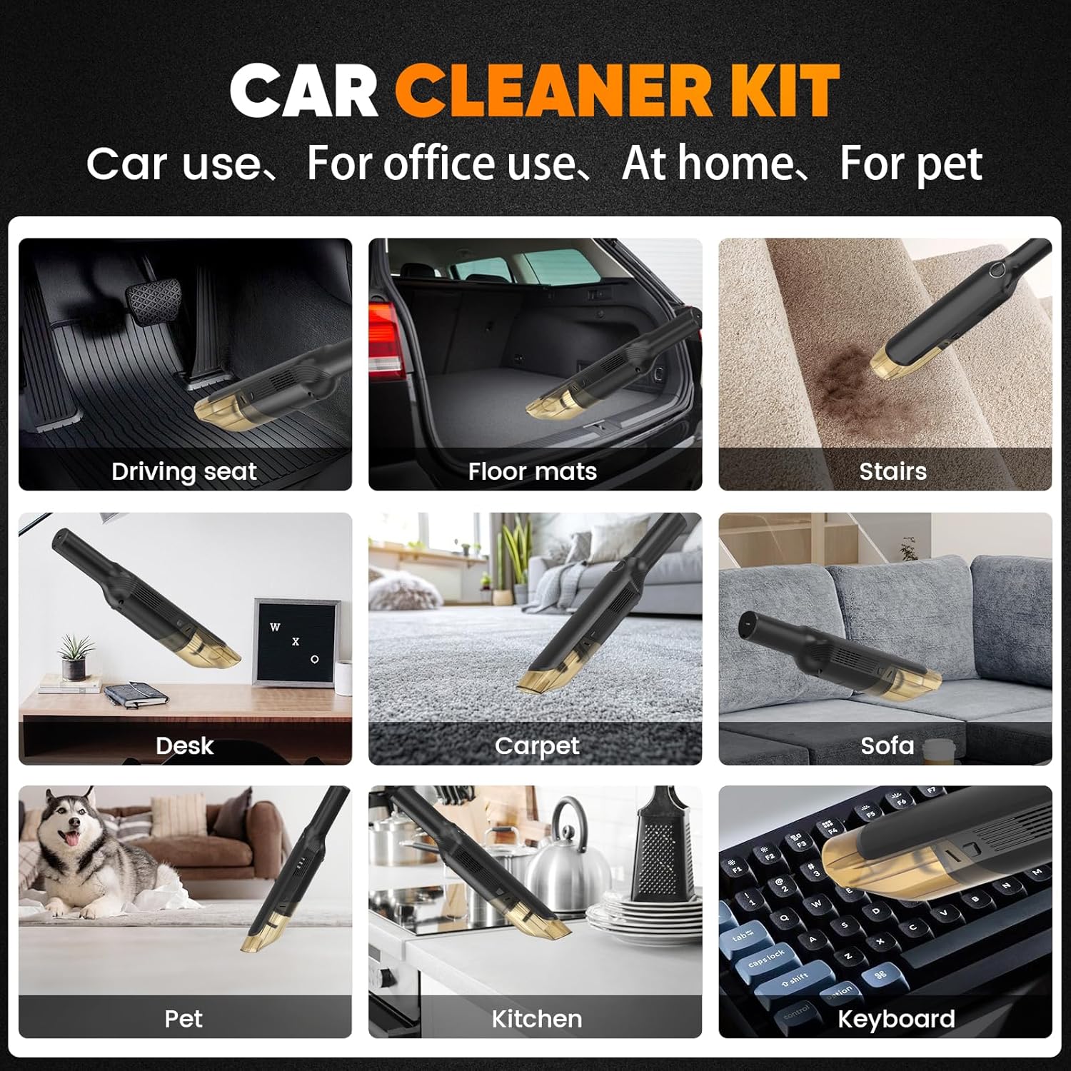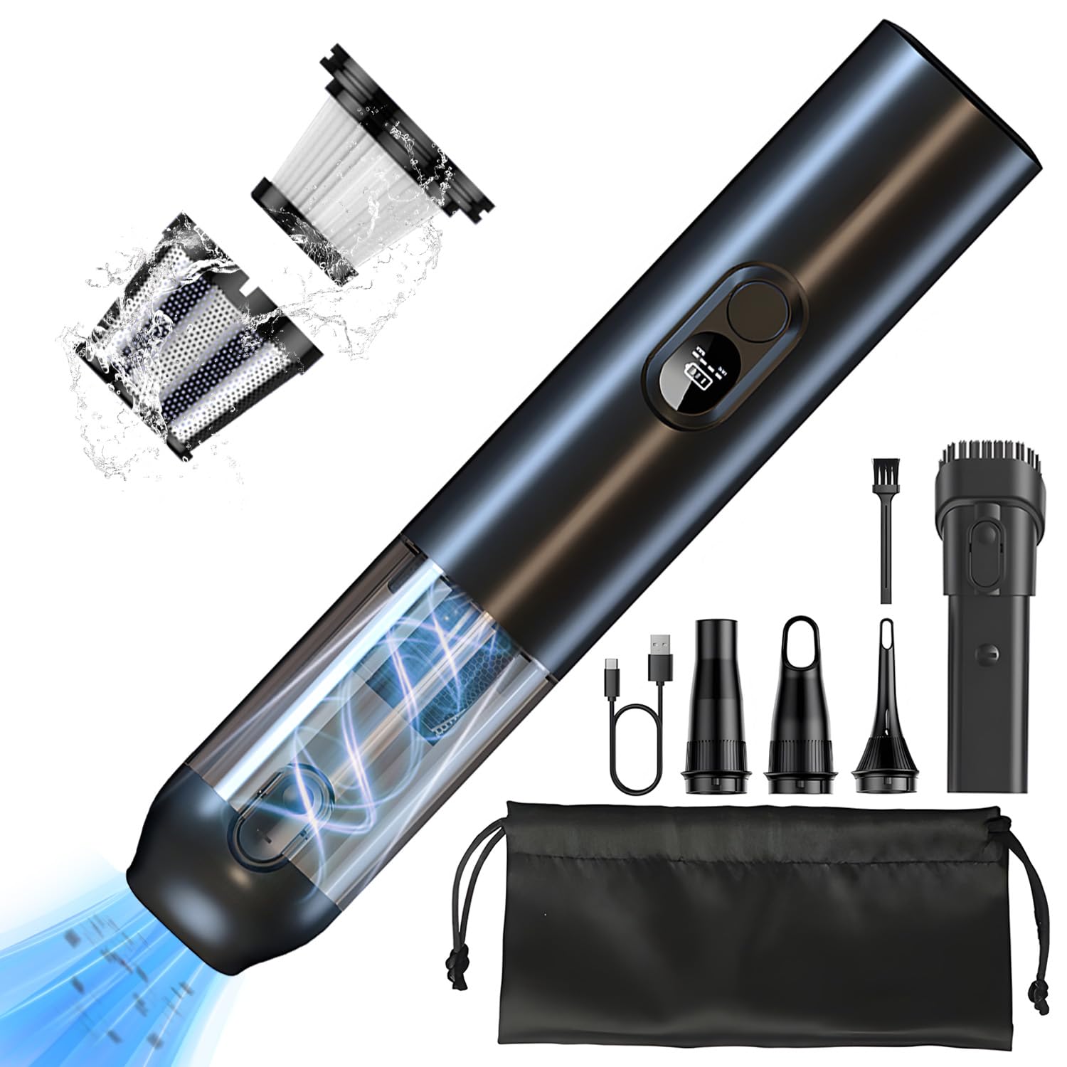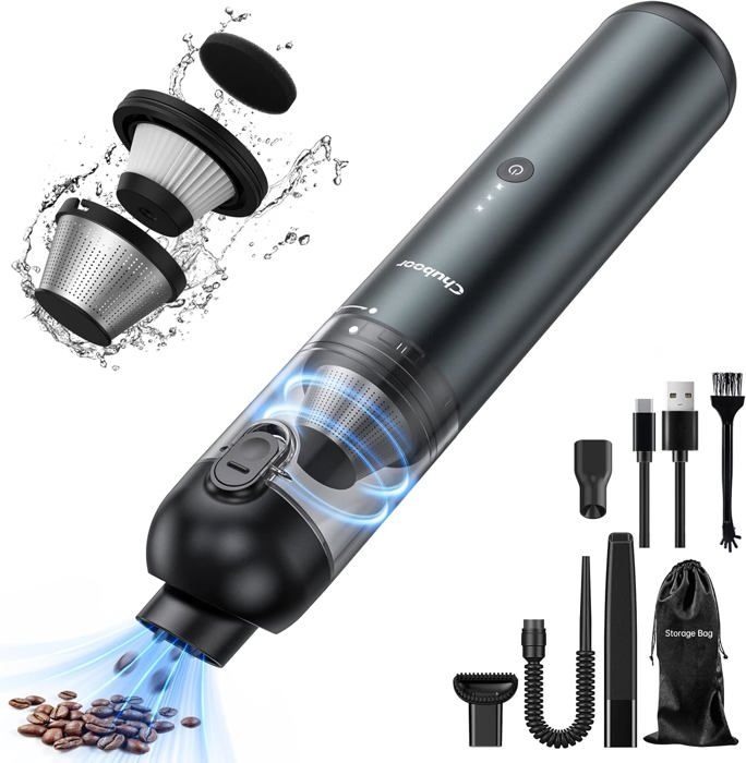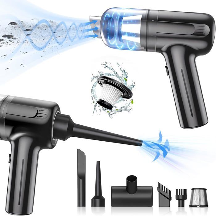 Mini Aspirateur Pour Clavier Aspirateur à Main Sans Fil, Aspirateur De Bureau Sans Fil Rechargeable 120 W Puissant Aspirateur De Voiture Silencieux 2600 Mah 30 Minutes 95346887 Aspirateur Voiture Portable 4 En 1 JoyFan Aspirateur à Main, 20000Pa Portable Aspirateur Voiture kitsky Aspirateur à ain, Aspirateur sans Fil, Aspirateur Voiture... C'est votre solution tout-en-un pour aspirer, souffler et gonfler. Rangez simplement l'outil de nettoyage dans le coffre de votre voiture pour l'avoir avec vous partout et à tout moment ! Après utilisation, vous pouvez vous débarrasser de la saleté en appuyant simplement sur un bouton, sans faire de dégâts. 1 DEUX MODES 2 AFFICHAGE LED HD, 【15., 000Pa Aspirateur de Voiture Puissant】 Vous en avez assez que le nettoyage de votre voiture soit une tâche fastidieuse ? Dites adieu aux moteurs à brosses chronophages et extrêmement inefficaces grâce à notre aspirateur de voiture sans fil avancé, doté d'une puissance d'aspiration 30% supérieure et de deux vitesses réglables (la vitesse basse peut être utilisée pendant 30 minutes et la vitesse haute pendant 15 minutes). 【Indicateur LED & moteur puissant de 120W】 Notre aspirateur à main est doté d'un écran LED pratique qui permet de surveiller la batterie en temps réel et de sélectionner le mode. Avec une vitesse de rotation pouvant atteindre 90 000 tours par minute et deux niveaux d'aspiration cyclonique : Eco-10., 000Pa et Max-14., 000Pa, qui viennent facilement à bout des petites saletés. La batterie lithium-ion de grande capacité 4*2000mAh offre un fonctionnement de 20 minutes de plus avec beaucoup moins de bruit inférieur à 75dB. Aspirateur Voiture, Aspirateur de Table sans Fil(0.68lb),Mini Aspirateur a Main,4500Pa Petit Aspirateur à Main Portable Puissant pour Voiture/Table