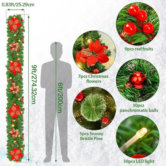La flexibilité de la guirlande la rend facile à mouler et à façonner autour de n'importe quoi, vous obtiendrez la guirlande parfaite pour cet endroit de votre maison ! Acheter Guirlande Sapin Artificiel, 9pieds Guirlande Noel Sapin Avec 30 LED, Guirlande Sapin De Noel à Piles Avec Fleurs, Boules, Pomme De Pin Our Porte... Les lumières sont à piles qui nécessite 3 piles AA (non incluses). Flexible et sûr Fabriquée dans un matériau de qualité supérieure, la guirlande de décorations de Noël vous permet de la façonner dans n'importe quelle forme que vous souhaitez et de la placer partout où vous en avez besoin. Décoration Noël Intérieur Extérieur Guirlande Sapin Artificiel 9pieds Guirlande Noel Sapin Avec Guirlande Sapin Artificielle 🎄【Liste des colis】 Pour ajouter plus de punch à un style de base, ajoutez 18 fruits rouges de Noël, 6 boules scintillantes, 18 pommes de pin, 30 aiguilles de pin à pois blancs, 7 fleurs argentées et une guirlande de 30 lumières LED. Il est flexible, réutilisable et respectueux de l’environnement., 2., Par rapport aux autres, nos couronnes de Noël ont des branches plus luxuriantes, plus délicates et plus d'accessoires., 3., Réaliste et sûr : pas besoin de vous soucier des risques de sécurité., 4., Facile à façonner et à bricoler, vous pouvez le placer où vous le souhaitez., 5., Parfait pour la décoration de Noël intérieure et extérieure, vous apportant la joie de Noël et la joie festive. 🎄【Réaliste et sûr】Avec des baies rouges, des fleurs et des boules métalliques incassables, cette guirlande sapin artificiel combine un savoir-faire raffiné et des années d'expérience, donnant à votre maison une sensation plus touffue et de Noël. Ajoutez une touche festive à votre maison avec cette élégance à feuilles persistantes. 🎄【Aucun entretien requis】La guirlande noel sapin est une alternative pratique aux plantes vivantes, elles resteront fraîches et seront tout aussi belles année après année et pourront être réutilisées. Remplissez votre maison d'une atmosphère de Noël. 🎄【Façonnez et appréciez】Utilisez votre imagination pour créer une décoration unique en ajoutant quelques décorations dans l'emballage à votre guirlande noel sapin, faites du bricolage avec vos amis et vos enfants. Façonnez et Appréciez: Utilisez votre imagination pour créer une décoration unique en ajoutant quelques décorations dans emballage à votre guirlande noel sapin, faites du bricolage avec vos amis et vos enfants. La flexibilité de la guirlande la rend Sans fiches ni fils, vous pouvez placer les lumières LED n'importe où dans votre maison. Vous n'avez pas à vous soucier du soleil, de l'eau, de la taille, de la fertilisation ou de tout autre entretien. Décorations de Noël gonflables - Décorations d'extérieur - Statues gonflables à LED - Sapin de Noël/Arche de