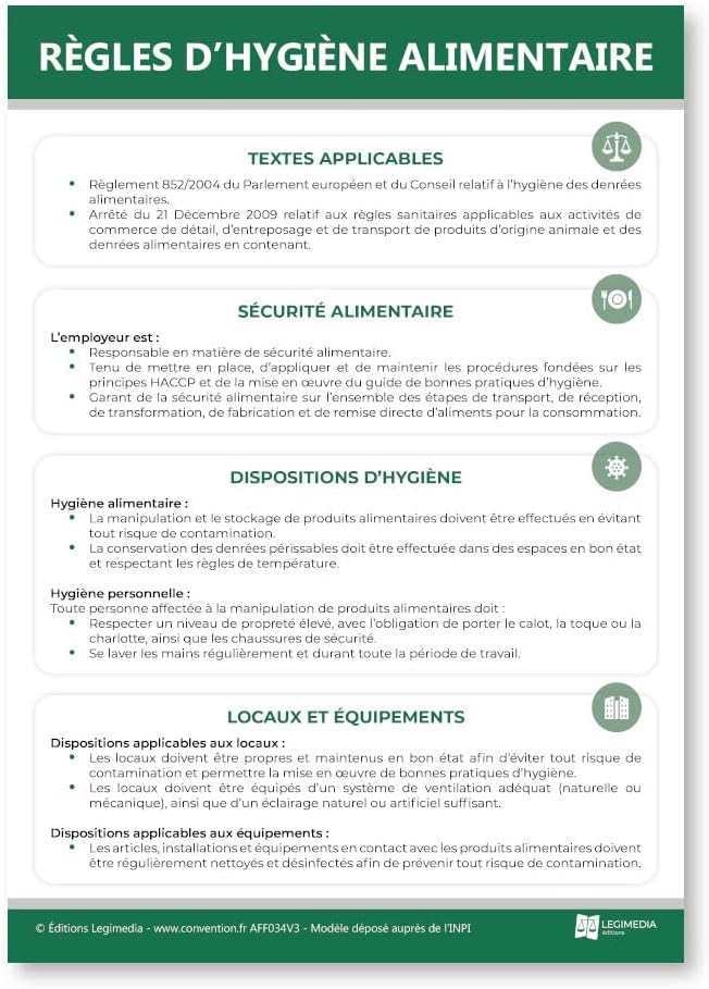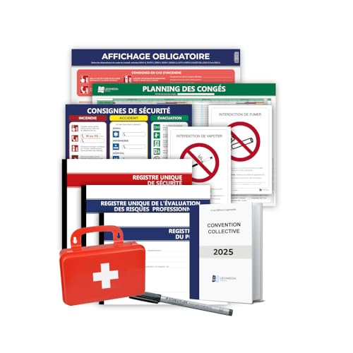 Contenu du pack : Affichage obligatoire : panneau complet, panneau des départs en congés, affichage interdiction de fumer, affichage interdiction de vapoter... Livre convention collective Le livre de la convention collective de votre secteur d'activité. Registre unique du personnel (64 pages) Au format A4., Ce registre permet à l'employeur, aux membres de l'entreprise, et à d'éventuels tiers (inspecteur du travail par exemple) de connaître les informations sur les salariés et stagiaires travaillant ou ayant travaillé dans l'entreprise durant les 5 dernières années. Le Pack affichages obligatoires, registres, convention collective. Ensuite, les articles concernant l'obligation sont listés et sont accompagnés d'une aide au remplissage. PACK Mise en Conformité intégrale toutes entreprises (11 produits) D'une part, ce pack permet à une entreprise d'être en conformité selon la loi et d'éviter des sanctions en cas de contrôle de l'inspection du travail (amendes pouvant aller jusqu'à 1 500 euros., ). Conformité entreprise est proposé pour chaque activité professionnelle : retrouvez le pack adapté à votre entreprise dans la boutique des Éditions Legimedia. Legimedia - L'expert mise en conformité de votre entreprise Registre unique de sécurité Au format A4., Ce registre permet à l'employeur de réunir les informations des vérifications générales et des observations liées, en matière d'hygiène et de sécurité, comme la date de vérification, le nom et l'organisme de l'agent vérificateur, l'objet de la vérification, les différentes observations liées et le numéro de référence du rapport. Affichage obligatoire : panneau complet (22 obligations) Au format A2., Ce panneau complet permet ainsi à l'employeur de remplir ses obligations d'affichage, en mettant à la vue de tous les salariés, l'ensemble des informations à afficher (ou à porter obligatoirement à connaissance des travailleurs). Kit Conformité Travail Inspection Tout Savoir Sur L'affichage Obligatoire En Entreprise Kit Conformité Loi Travail Éditée le jour de la commande, garanti à jour des derniers textes publiés par la DILA. Panneau consignes de sécurité Au format A4., L'affichage des consignes de sécurité met en évidence les manœuvres et agissements pour faire face à un événement mettant en danger l'intégrité physique ou morales des salariés. D'autre part, les produits présents à l'intérieur permettent de transmettre des informations importantes à tous les salariés comme les consignes à respecter en cas d'incident, l'interdiction de fumer ou de vapoter dans les locaux, ou des informations générales concernant l'entreprise. Notre pack de mise en conformité pour TPE/PME vous garantit une mise en conformité rapide et efficace grâce à un ensemble d'affichages obligatoires et de documents obligatoires inclus. Ces affichages sont rédigés et mis à jour par nos juristes en droit du travail Elle possède les différents équipements cités ci-dessous, destinés à soigner différentes blessures pouvant être causées par l'activité de l'entreprise (coupures, brûlures, chute, etc., ). Enfin il précise les zones des vacances scolaires et les dates des jours fériés pour l'année en cours. Contenu du pack : Affichage obligatoire : panneau complet, panneau des départs en congés, affichage interdiction de fumer, affichage interdiction de vapoter, panneau consignes de sécurité, stylo-feutre non permanent pour affichage, registre unique du personnel, document unique de l'évaluation des risques professionnels – pré-rempli, registre unique de sécurité, trousse de secours et convention collective. Stylo-feutre non permanent OFFERT Stylo-feutre non permanent pour affichage., OFFERT Panneau des départs en congés Au format A2., Le planning permet de renseigner l'ordre de départ en congés de 20 salariés, ainsi que le nombre de jours posés cumulés, afin de connaître le nombre total de jours posés (et donc restants) pour chaque employé. Il vous assure d'être en totale conformité car il comprend l'ensemble des produits imposés par le droit du travail.