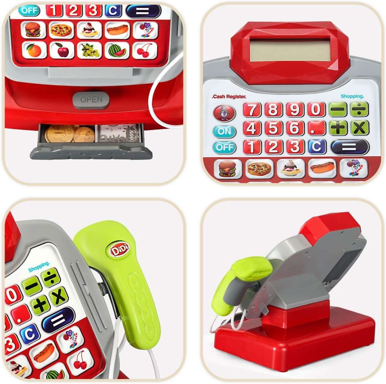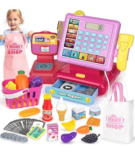 Jeu Imitation Supermarché Caisse Enregistreuse Jouet | Scanner Éducatif Interactif Avec Caddie Et Cadeau Anniversaire Enfants Jeu Imitation Caisse enregistreuse jouet SHOPMASTER pour enfants | Lumières deAO Caisse Enregistreuse Jouet Scanner, Microphone, Bande et Lecte... Construit en plastique durable, cet enregistreur de caisse comprend galement une fente pour les cartes de cr dit, simuler des achats en magasin en toute sécurité. Avertissement De Sûreté A utiliser sous la surveillance d'un adulte Enregistreur de caisse jouet : comprend un scanner sonore, des lumières et des accessoires pour magasins pour stimuler la fantaisie et le développement des enfants Description du produit Ce joli enregistreur de caisse jouet est le cadeau parfait pour les petits entrepreneurs en herbe. Scansion et paiement : les enfants peuvent « scanner » des jouets et les payer en insérant les pièces dans la fente, en développant des compétences motrices et des concepts mathématiques Jeux de rôle pour enfants : accessoires inclus comme étiquettes de prix, tickets, carte de crédit pour faire semblant de gérer un véritable magasin Dimensions compactes : léger et de petite taille pour être transporté partout pour stimuler l'imagination des enfants à tout moment Modèle Jouet Caisse Enregistreuse Caisse Caisse Simulation Scanner...