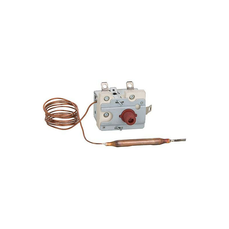 RIELLO - Thermostat sécurité réf R100506 Réf. 4048998 Thermostat à pastille de contact 165 °C normalement fermé avec bride fixation avec 2 trous Faston horizontaux de 6,3 mm, Cut-off à 165°C Thermostat Normalement Fermé Bride 2 Trous Thermostat De Securite Bbsc0013 - ATLANTIC : 070272 Thermostat Coupure Fixe NC Le thermostat fixe à pression avec bride à 165°C et contact normalement fermé (NC) avec contacts faston de 6,3 mm est un dispositif de contrôle de température qui interrompt le circuit lorsque la température atteint 165°C Safety thermostat switch-off temp. 135 °C 3 -pole 20 A probe ø 6 mm...