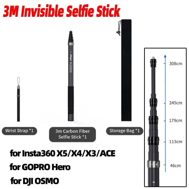 Sa dragonne intégrée sécurise la caméra en cas de chute, tandis que la poignée striée garantit une prise ferme même avec des gants. Accessoire Insta 360 X4 120CM Perche à Selfie Invisible Pour Insta X3 X4 RS, Support De Selfie Perche Télescopique 150cm 【Compatibilité universelle et créative】 Grâce à son pas de vis 1/4 et à l’adaptateur pour GoPro Hero 13 12 11 10 pour DJI Osmo 360 fourni, la perche insta360 x3 se fixe aussi bien sur une caméra d’action, un micro directionnel ou un smartphone équipé d’un support. Perche à selfie invisible Insta360 【Tige télescopique ultra-résistante】En alliage d’aluminium aéronautique, Perche à Selfie Invisible pour Insta 360 X5 X4 X3 ONE X2 X Ace s’allonge jusqu’à 150 cm en un tour de main, vous propulsant au-dessus de la foule ou au plus près de la vague. Les sept segments coulissants se bloquent fermement pour éviter tout flottement, même lorsque vous enchaînez les figures de snowboard ou les descentes en VTT. Insta360 Perche à Selfie Invisible avec Chargeur de caéra intégré pour Insta360 X3, One X2 et... Une fois la caméra activée, la tige disparaît de l’image en temps réel, offrant des panoramas aériens dignes d’un drone, sans post-traitement ni réglage fastidieux. Vous passez d’un vlog urbain à une session de surf sans changer d’accessoire. Vos vidéos restent stables, nettes et dynamiques, quelle que soit l’intensité de l’action. Perche Selfie Appareil Photo pas cher - Meilleures ofes neuf et occasion 【 Perche à Selfie Invisible】 Perche à Selfie Invisible pour insta360 x3 qui se fond littéralement dans l’air : c’est exactement ce que propose ce modèle grâce à son algorithme de disparition intégré. 【Format poche, format aventure】Repliée à 28,5 cm, la perche pour insta360 x3 tient dans la paume de la main et se glisse dans une poche de veste ou dans le compartiment inférieur d’un sac à dos.