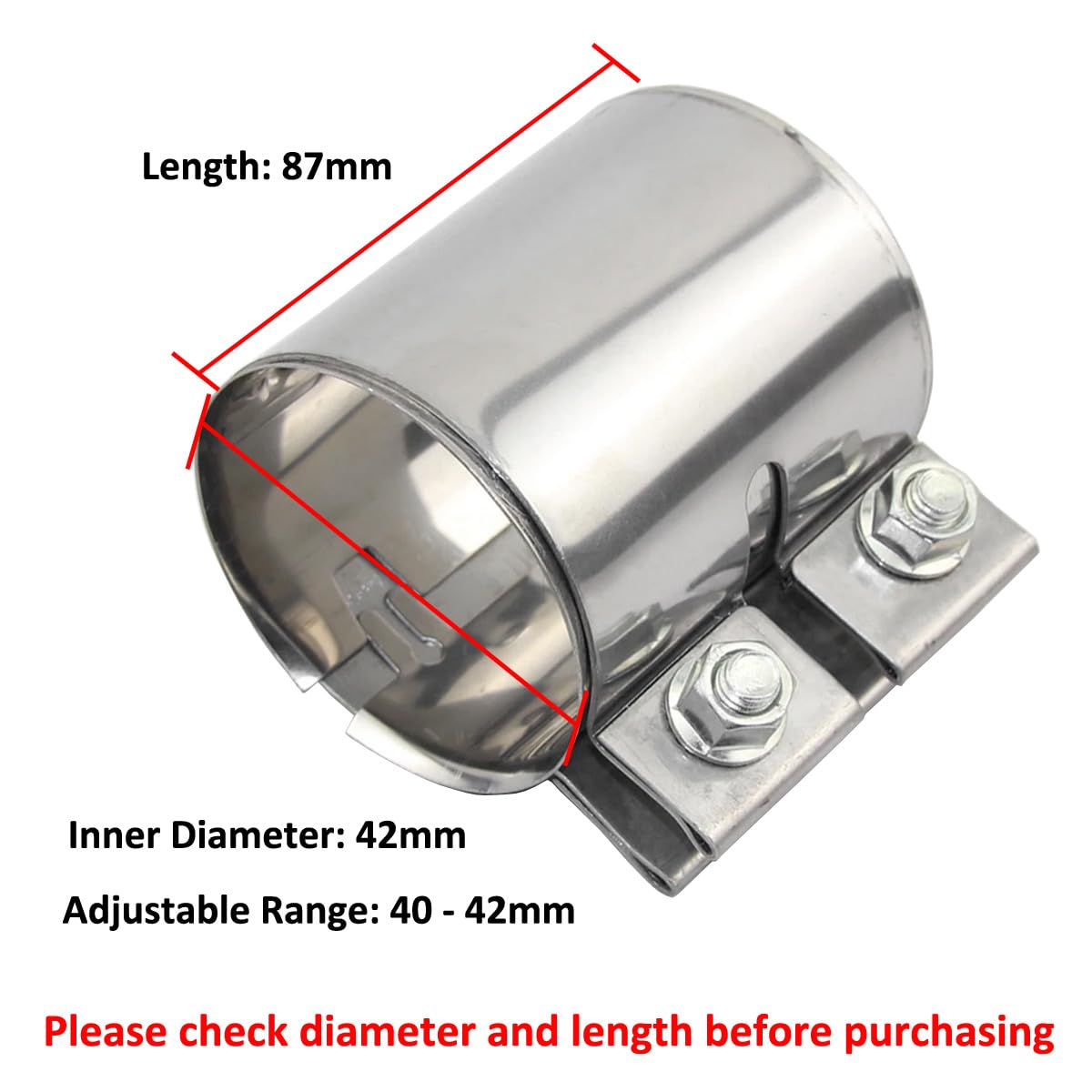 Veuillez vérifier le diamètre et la longueur avant l'achat. Pince A Manchon Collier De Serrage à Dégagement Rapide En Acier In... - Grandado Pince Collier Echappement 【 Largement Utilisé 】 Il assure une connexion solide et fiable. 【 Conception Sans Soudure 】 Pas besoin de sertissage, de soudage ni de perçage ; l'installation et le démontage des composants sont plus rapides et plus faciles. ) L'installation des colliers de serrage est plus rapide, plus facile et plus précise. Il peut être utilisé pour l'installation tuyaux d'échappement, descentes d'échappement, pots catalytiques et silencieux pour voitures et camions. Raccord Tuyau échappement Collier De Serrage Échappement JXDWTL 【 Collier de Serrage pour Tuyau D'échappement 】 Ce collier de serrage pour tuyau d'échappement bout à bout s'insère entre des sections de tuyau d'échappement de même diamètre pour une connexion solide et fiable, sans soudure. 【 Excellente étanchéité 】 Le tuyau d'échappement est installé avec une structure en plaque d'acier inoxydable double couche et des vis doubles. Diamètre réglable: 40mm-42mm. Il suffit de placer une des bandes d'écrou d'un côté, d'insérer les boulons, de placer l'autre bande d'écrou et de serrer les écrous. Il peut également être utilisé pour les raccordements de tuyauteries domestiques et industrielles. Caractéristiques du design : cette pince de serrage en acier inoxydable est conçue avec une zone de serrage complète à 360 degrés, et la force de serrage est uniformément répartie sur toute la plage de 360 degrés pour éviter les fuites et contrôler la déformation du pipeline EN STOCK : Collier de Tuyau d'échappement Connecteur Tuyau d'échappement Collier Serrage Echappement Raccord Tuyau échappement Manchon Echappement Colliers... Contenu de l'emballage: 1 x raccord de tuyau d'échappement 2 x colliers de serrage d'échappement Diamètre intérieur: 42mm, longueur: 95mm. La force de serrage est uniformément répartie pour éviter toute déformation du tuyau. Remarque: Ce collier de serrage est conçu pour assembler des tuyaux et tubes de même diamètre sans soudure., Caractéristiques: 1., Matériau durable: fabriqué en acier inoxydable, il est doté d'une double couche d'acier inoxydable épaissie et élargie, plus épaisse, plus solide, résistante à la corrosion et durable., 2., Ajustement sûr: ce collier de serrage assure un ajustement serré et sûr à votre système d'échappement, évitant les fuites et réduisant le bruit., 3., Performances améliorées: en fixant le système d'échappement avec ce collier, vous améliorez les performances de votre voiture et réduisez les risques de dommages., 4., Installation facile: grâce à sa conception simple et à son écrou et boulon, ce collier s'installe rapidement., 5., Largement utilisé: modèle universel, adapté à une large gamme de véhicules et de tailles de tuyaux d'échappement., Installation: 1., Il suffit de placer une tige d'écrou d'un côté et d'insérer le boulon, puis de placer l'autre tige., 2., Serrez progressivement les deux boulons en alternance pour assurer une répartition uniforme de la pression.