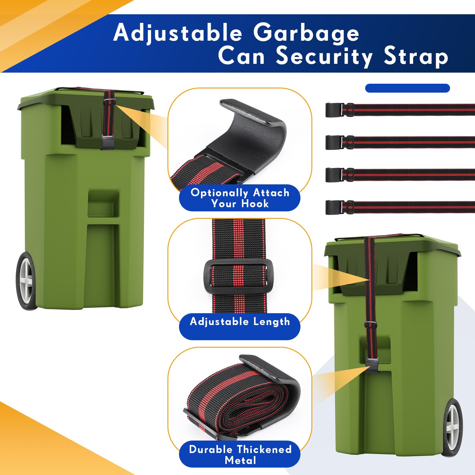 🎁Contenu : 2x verrous de couvercle de poubelle Sangles 💡Remarque : 1., Veuillez prévoir une marge d'erreur de 1 à 3 mm en raison des mesures manuelles., 2., En raison des réglages de l'écran et de l'éclairage, la couleur réelle de l'article peut différer légèrement de celle de la photo., 📋Étapes d'installation : 1., Accrochez le crochet sur le bord du couvercle de la poubelle., 2., Ajustez la longueur jusqu'à ce que le couvercle se verrouille., 3., Accrochez le crochet à l'autre extrémité du couvercle de la poubelle. Les ceintures en nylon ont une excellente résistance et de la ténacité, une usure et une résistance à la corrosion. ♻️【À Usage Multiple】 Le verrouillage des poubelles peut prévenir efficacement les animaux sauvages tels que les ratons laveurs, les renards, les ours, les chiens, les chats et les coyotes de renverser la poubelle. ✔ Évite les débordements et les ajouts inutiles. Serrure - barillet,Serrure de porte de toilette, interrupteur de ♻️【Matériaux de Haute Qualité】 La poubelle peut verrouiller le fil en caoutchouc et le nylon. ✔ Plus besoin de craindre que des animaux de petite et moyenne taille ne la renversent. VERROUILLAGE DE COUVERCLE universel console centrale de remplacement... Pas besoin d'acheter plusieurs fois, 2 ceintures de sécurité peuvent répondre à tous vos besoins en matière de sécurité des ordures. ✔ PROTÈGE LA POUBELLE : Empêche l’eau de pluie de pénétrer dans la poubelle et le vent de la faire voler dans votre jardin. Convient pour les poubelles à rouleaux standard (résidentiels / commerciaux) et toutes les poubelles avec un bord de plus de 1 pouce. Poubelle Extérieur Serrure - Barillet,Loquet De Réparation De Couvercle De Poubelle, 1 Serrure Extérieur Sangle couvercle boite à air Frontera Gardez l'intégrité du bac et les dégâts zéro de forage.