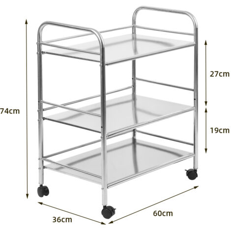 Il utilise efficacement l'espace vertical pour optimiser l'espace au sol. Roues sans soudure : les roues de ce chariot de service sont sans transpiration pour éviter le risque de chute des roues en raison de faibles points de soudure. Et il y a deux freins qui le maintiennent efficacement en place, ce qui évite beaucoup de problèmes. Poignée intégrée : la poignée de ce chariot de service est ergonomique, ce qui rend le levage ou le déplacement du chariot très pratique et facile. Chariot 3 étagères Roulettes Chariot De Service En Inox Avec 5 Niveaux - Mastro Chariot Inox Il peut également être utilisé comme garde-corps surélevé pour empêcher les objets de tomber. Caractéristiques techniques : Style : simple, moderne Matériau : acier inoxydable 201., Couleur : argenté. Grand espace de rangement à 3 niveaux : ce chariot de service à 3 niveaux offre beaucoup d'espace de rangement pour la vaisselle, la nourriture ou les outils. Bords polis en toute sécurité : grâce à la technologie de polissage, tous les bords sont lisses et arrondis. Chariot de Service Acier INOX Chromé - Yipeema - 3 Niveaux Plan de travail plus large : ce chariot de service a un plan de travail plus large pour faciliter le rangement de plus d'objets. pour ranger la vaisselle, la nourriture, les casseroles, les poêles, les outils, les ordinateurs, les imprimantes, les écrans, les haut-parleurs, les plantes, les livres, etc., Installation : 1., Insérez la plaque dans le support approprié., 2., Utilisez l'outil pour sécuriser les vis., 3., Insérez trois plaques et serrez les vis., 4., 4 roues., 5., L'installation est terminée. Ce chariot de service garantit une manipulation sûre sans risque de blessure. Chariot de cuisine peu encombrant : avec seulement 29,53 x 15,75 pouces, ce chariot de cuisine prend un minimum de place. CHARIOT INOX – 3 ÉTAGES – ETS Chariots de service en acier inoxydable Chariots de taille compacte pour rouler aisément dans les cafés et hôpitaux. Tablettes supérieures avec avant ouvert et rebord de 1 po. Butoirs pour protéger murs, tables et portes. Acier inoxydable de type 430. Roulettes pivotantes en caoutchouc de 4 po : 2 blocables. 2 tablettes – À une distance... Plan de travail encastré : le plan de travail est encastré pour que les objets posés dessus ne glissent pas facilement lors du déplacement. Remarques : Les mesures étant prises à la main, les tailles indiquées peuvent varier de 1 à 3 cm. Contenu de la livraison : 1 chariot de service. Il garantit durabilité et robustesse pour une longue durée de vie. Idéal pour les objets lourds tels que les pots ou les appareils. Poids du produit : 9 kg Poids du colis : 9,6 kg.