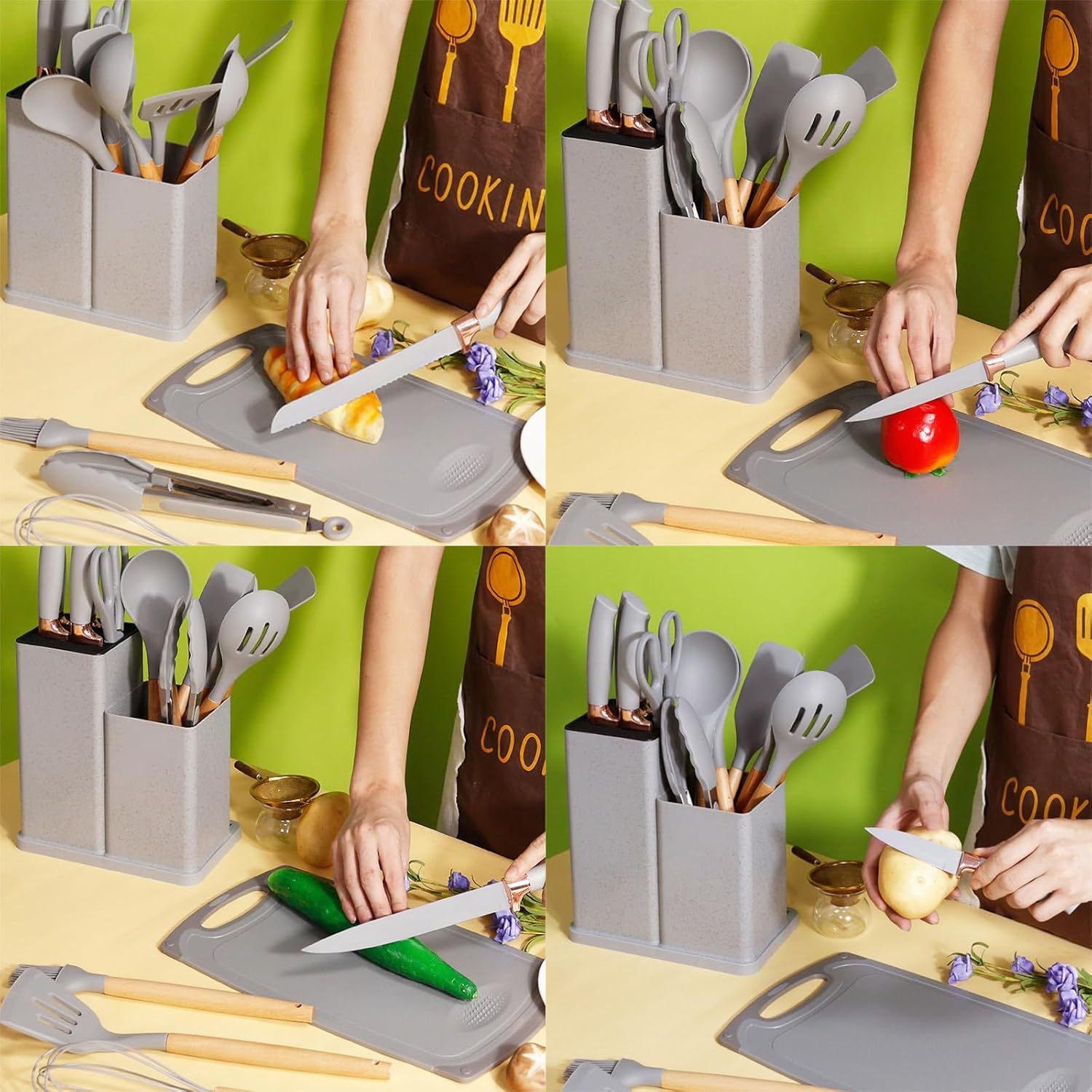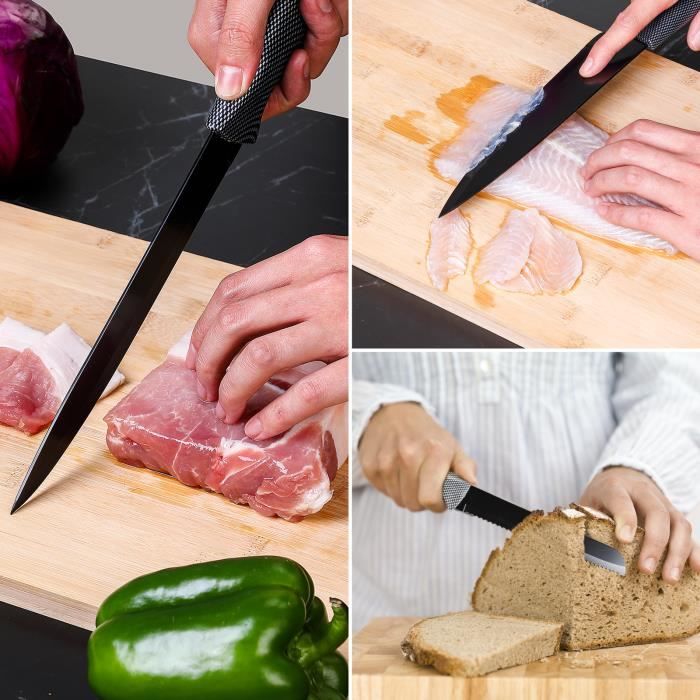 Que vous remuiez, coupiez ou retourniez, vous gardez un contrôle total tout en réduisant la fatigue des mains. Flearitzo Lot De 19 Couteaux De Cuisine En Silicone Avec 12 Ustensiles De Cuisine 5 Couteaux Planche A Decouper Et Support Passe Au Lave Vaisselle Noir Boîte de Rangement Élégante en Forme de Losange Gardez votre cuisine propre et organisée grâce à la boîte de rangement design en forme de losange – idéale pour un accès rapide et un gain de place. Accessoires Cuisine Vortix 19 Pièces Kit Ustensiles De Cuisine, Set De Couteaux Et Ustensiles De Cuisine, Set De Spatule Silicone Avec Poignée En Bois, Noir Couteaux Inox Et Ustensiles Silicone Poignées ergonomiques antidérapantes – Confort et contrôle optimal Chaque ustensile est équipé d’une poignée ergonomique antidérapante qui assure une prise en main confortable même lors d’une longue utilisation. Parfait pour la cuisine quotidienne ou les repas festifs, il vous accompagne de la préparation à la présentation. Bloc en bambou de qualité avec 5 couteaux, idéal pour tous les amateurs de cuisine. Ce bloc à couteaux combine fonctionnalité et esthétisme, apportant une... Cadeau Parfait pour Tous les Cuisiniers Présenté dans un bel emballage, ce set est une excellente idée cadeau pour les anniversaires, mariages, pendaisons de crémaillère ou toute autre occasion. Parfait pour un cadeau de pendaison de crémaillère, mariage ou pour les passionnés de cuisine, un présent utile et esthétique. Les ustensiles en silicone - y compris un fouet, une spatule, une louche, une cuillère à pâtes et diverses cuillères de cuisson - sont résistants à la chaleur et ne rayent pas vos ustensiles de cuisine Compatible avec tous les modes de cuisson et doux pour toutes les casseroles, comme antiadhésives, fonte ou céramique, prolongeant la durée de vie des ustensiles et des casseroles. Silicone alimentaire résistant à la chaleur – Cuisine sûre sans souci Tous les ustensiles sont fabriqués en silicone alimentaire de haute qualité, sans BPA, résistant jusqu’à 230 °C. Kit Complet de 19 Pièces Cet ensemble contient 5 couteaux en acier inoxydable, 1 planche à découper et 13 ustensiles en silicone pratiques pour répondre à tous vos besoins culinaires du quotidien. Description du produit Couteaux en acier inoxydable de haute qualité – Tranchants et durables Les couteaux sont fabriqués en acier inoxydable résistant à la rouille et à la corrosion. Utilisation Confortable et Sécurisée Les poignées ergonomiques antidérapantes assurent une prise en main confortable et stable pendant la cuisson, même avec les mains mouillées.