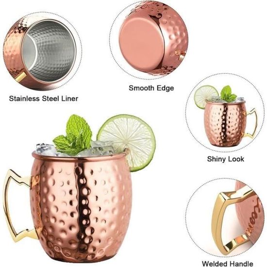 Coffret Moscow Mule Set De Tasses Moscow Mule En Acier Inoxydable Tasse Moscow Mule Vezato Verre Moskau Mule [500ml] - Verre en cuivre pour Moskau Mule EJ.life Verre à Martini en Acier Inoxydable 150 ml Acier Inoxydable Martini Cocktail Verre... Les tasses en cuivre offrent une sensation de froid directement sur vos lèvres. Taille : matériau : acier inoxydable 304., Capacité : 430 ml., Poids net : 0,1 kg. Finition de surface : plaqué cuivre., Taille : 8 x 10 cm. Grande tasse en cuivre de 49,9 g, idéale pour la bière, le café glacé, le thé glacé et toutes les boissons mélangées de vodka, de gin, de rhum ou de tequila. MATÉRIAU DE QUALITÉ SUPÉRIEURE - Fabriqué en acier inoxydable 304 avec finition miroir, donne un aspect brillant, lisse et intemporel. DURABLE - Nos tasses Moscow Mule en acier inoxydable sont très durables, peuvent être utilisées dans toutes sortes d'événements et ne rouillent pas Capacité de 18 oz - Notre acier inoxydable de grande capacité est idéal pour la bière fraîche, le café glacé, le thé glacé et toutes les boissons mélangées à la vodka, au gin, au rhum, à la tequila ou au whisky. Capacité de 530 ml. Taille parfaite : notre grande tasse en cuivre de 532 ml fonctionne parfaitement pour la bière fraîche, le café glacé, le thé glacé et toutes les boissons mélangées de vodka, gin, rhum, tequila ou whisky