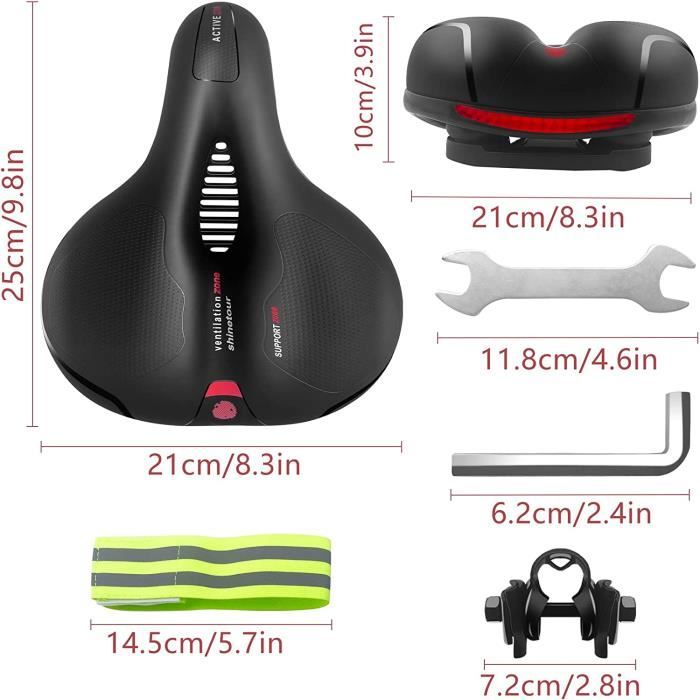 Housse de protection imperméable incluse pour une protection supplémentaire. Conception 3D ergonomique : Cette selle de vélo confortable pour femme, confortable et souple, est dotée d'une zone anatomique qui s'adapte parfaitement aux ischions. Selle Confort Velo RIXOW Selle Velo Confortable, Selle De Velo Absorbant Les Chocs, Siège De Vélo Imperméable Respirant, Selles Ergonomique Hommes Et Femmes Pour VTT, Vélos De Route, Vélos De Ville Selle De Vélo Décathlon GUOMIS Selle de Vélo, Selle de Velo Confort, Selle de Velo Ultra... Les points de pression sont minimisés, la circulation sanguine est favorisée et les douleurs au niveau des fesses et des nerfs sciatiques sont efficacement prévenues. Caractéristiques : -- Cette selle de vélo confortable pour homme, également adaptée aux femmes, est dotée d'un revêtement en tissu Oxford imperméable et d'une mousse à mémoire de forme haute densité qui épouse la forme de vos hanches. Que vous fassiez du vélo en ville, du VTT ou des randonnées longue distance, vos fesses seront comme sur des nuages. La selle de vélo confortable convient à tous les types de vélos. La conception avant étroite réduit les frottements sur les cuisses. -- Les bandes réfléchissantes étendues améliorent la visibilité des véhicules et des piétons, augmentant ainsi la sécurité nocturne. 【Système d'amortissement à double ressort】Deux sphères à ressort et une base d'amortisseur incurvée absorbent efficacement les vibrations et offrent une excellente stabilité sur les surfaces irrégulières. Nous vous fournirons un produit satisfaisant. Selle de randonnee grand confort - Le vélo en image L'ouverture de ventilation centrale assure une circulation d'air optimale et réduit l'humidité. Outils et instructions inclus. --- Son design ergonomique et son élasticité optimisée garantissent une conduite confortable et sans compression, idéale pour les longues distances ou les trajets quotidiens, que ce soit comme selle de vélo confortable femme ou homme. Selle de vélo femme, nos conseils pour l'ajuster à votre morphologie