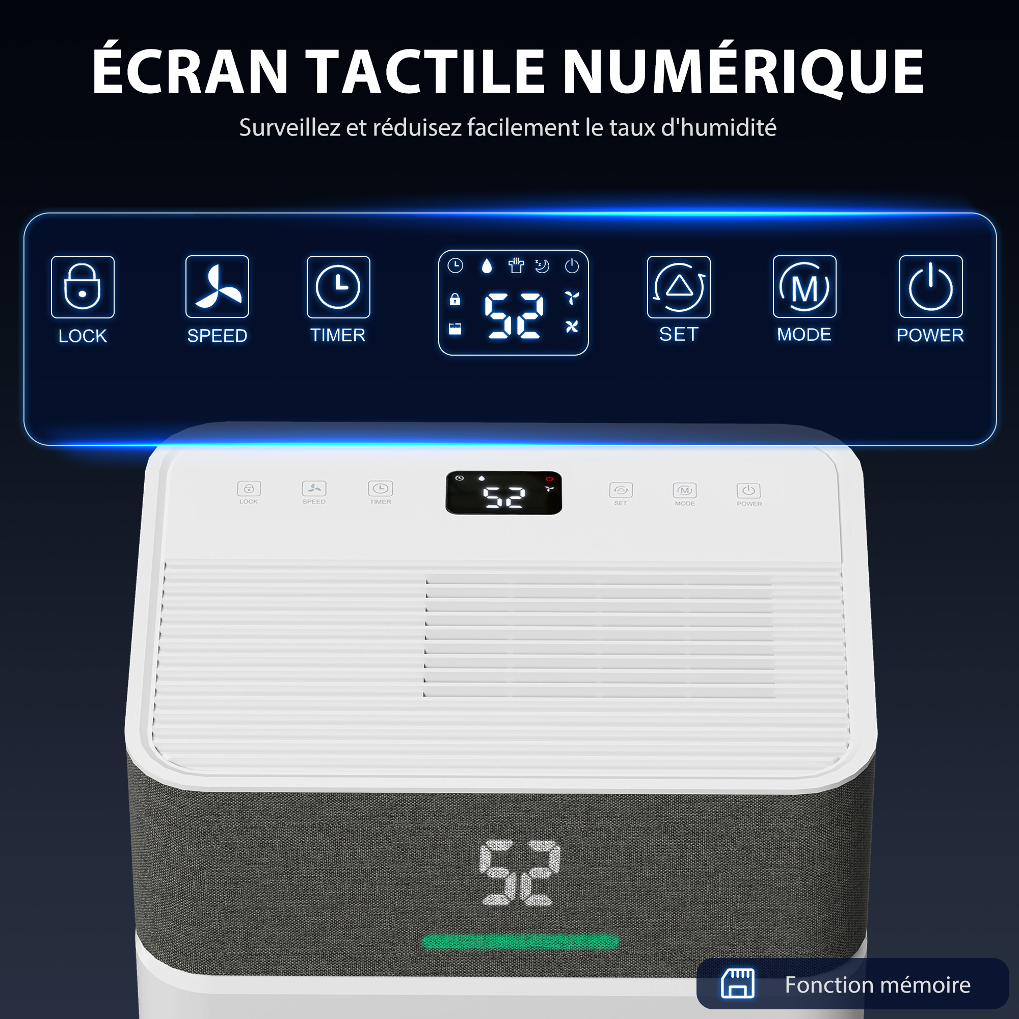 Caractéristiques:● Déshumidification efficace et séchage du linge ● Fonctionnement silencieux à 36 dB, vous garantit un repos sans perturbations ● Minuterie de 24 heures et réfrigérant R290 pour des économies d'énergie ● Ce déshumidificateur d'air dispose des modes normal/continu/fort/séchage/sommeil, contrôle précis de l'humidité, deux vitesses de ventilation, ainsi qu'un verrouillage de sécurité pour enfants. HOMCOM Déshumidificateur 12 L/j Silencieux – Écran LED Le mode sommeil garantit une nuit confortable, et la sécurité est renforcée par un verrouillage enfant, le tout facile à contrôler via un panneau tactile du déshumidificateur de maison. Deshumidificateurs Sous Sol HOMCOM Déshumidificateur Portable électrique Silencieux 195W Réservoir 2L évacuation Continue 10L/24H Idéal Pièces 12m² Max. - Bricolage Déshumidificateur Pour Cave Redécouvrez le confort de votre foyer dans une ambiance apaisante. Contrôle facile avec le panneau LED ● Les indicateurs supérieurs affichent les niveaux d'humidité via un codage couleur. 12L/Jour Deshuidificateur d Air - Contrôle Intelligent de l'huidité... GRAND RÉSERVOIR D'EAU DE 2,1 L : Son large réservoir réduit la fréquence des vidanges et permet le branchement d'un tuyau pour un drainage continu. Le mode sommeil, plus silencieux à 33 dB, et une minuterie de 24 heures avec réfrigérant R290 optimisent la consommation d'énergie. Pro Breeze Déshumidificateur Compresseur 12 L/jour Avis FONCTIONNEMENT SILENCIEUX, FAIBLE CONSOMMATION D'ÉNERGIE : Avec un niveau sonore bas de 36 dB, ce déshumidificateur d'air électrique assure un environnement calme, parfait pour le repos ou la concentration. Plus un tuyau de drainage pour un drainage continu ● Équipé de roues à 360° pour une mobilité aisée ● Filtres à charbon actif et à air lavables, maintiennent l'air propre tout en étant faciles à nettoyer ● Montage nécessaireSpécifications:● Couleurs : blanc, noir ● Matériau : ABS ● Dimensions totales : 28l x 18,5P x 50,5H cm ● Capacité de déshumidification : 12L/jour ● Volume du réservoir d'eau : 2,1L ● Réglage de l'humidité : 30 %-80 % ● Longueur du cordon : 1,8 m ● Superficie adaptée : 12-25 m² ● Niveau de bruit : 36 dB (mode standard), 33 dB (mode sommeil) ● Entrée : AC 220-240V, 50Hz ● Puissance : 300W/1,65A ● Réfrigérant : R290 ● Température de fonctionnement : 5-32°C ● Réf. MULTIFONCTION : Choisissez parmi les modes normal, continu, intensif ou séchage, et ajustez l'humidité à votre convenance avec deux vitesses de ventilation pour un séchage du linge plus efficace. Son capteur affiche l'humidité pour un contrôle aisé et le mode nuit assure des nuits tranquilles. La fonction mémoire d'humidité préserve vos réglages même après extinction.