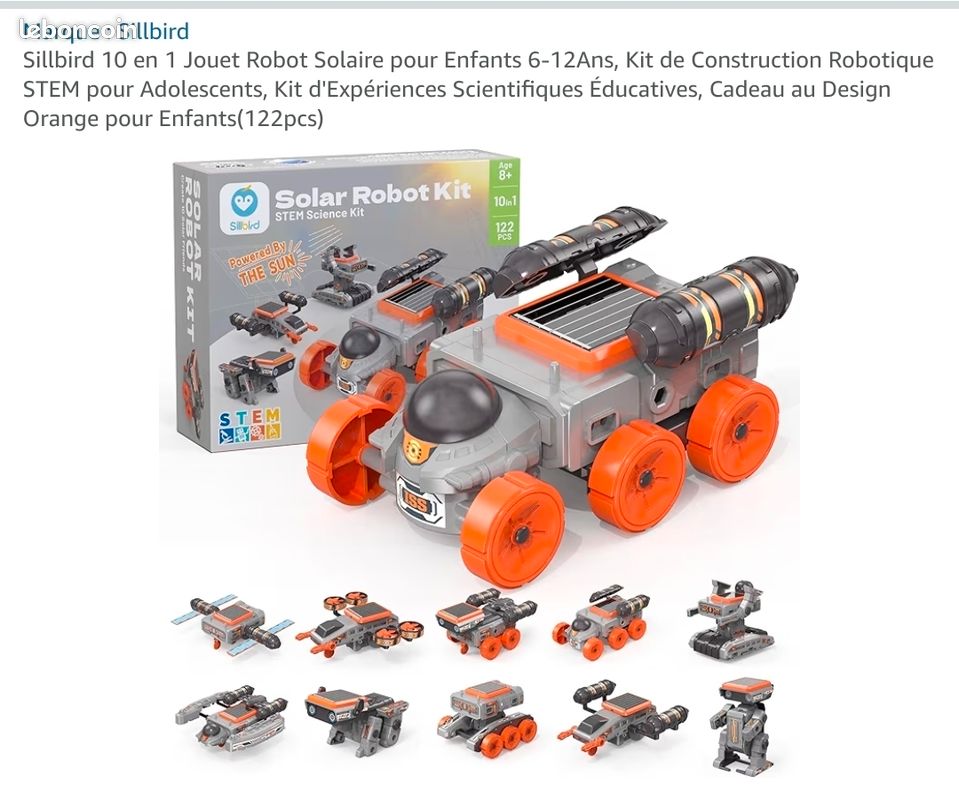 Sillbird STEM 12-en-1 Jouets éducatifs robots solaires - 190 Une manière ludique et interactive de comprendre dès le plus jeune âge la durabilité et les technologies vertes. Robot Solaire Enfants Sillbird – STEM – Jouets STEM Pour Enfants, Kit D’expériences Scientifiques Robot Solaire 11 En Kit Scientifique 6-12 Ans Les différents niveaux de difficulté les motivent et développent leur esprit logique, leur concentration et leurs compétences pratiques en matière de construction. Sillbird STEM Jouet robot éducatif 12 en 1, 190 pièces; kit scientifique de construction pour enfants âgés de 8 à 13 ans et plus, alimenté par le soleil : : Jeux et JouetsÀ propos de cet article Cadeau idéal pour les enfants et les adolescents Sillbird Robot solaire pour enfants à partir de 8 ans - Kit de construction 12 en 1 STEM - 190 pièces - Jouet éducatif - Cadeau pour garçons et filles à partir de 8 : : Jeux et JouetsDemandez le retour d'un produit jusqu'à 14 jours après sa réception, sans motif, pour obtenir un remboursement complet (prix et frais de livraison) au titre du droit légal de rétractation... 👧 Momentos de Aprendizaje en Familia: Una gran forma para que padres o abuelos conecten con los niños mediante el juego práctico. Perfecto para cumpleaños, Navidad y ocasiones especiales, este kit de robot solar despierta la creatividad y la curiosidad por STEM. Construir juntos fortalece los lazos familiares y fomenta el trabajo en equipo, la paciencia y la resolución de problemas. 1 De simple à complexe 2 Étape par étape 3 Tout le contenu Su diseño resistente soporta montajes repetidos y ofrece una experiencia de juego y aprendizaje fiable y segura. 1 Jeux d'extérieur 2 Jeux d'intérieur 3 Jeux éducatifs STEM