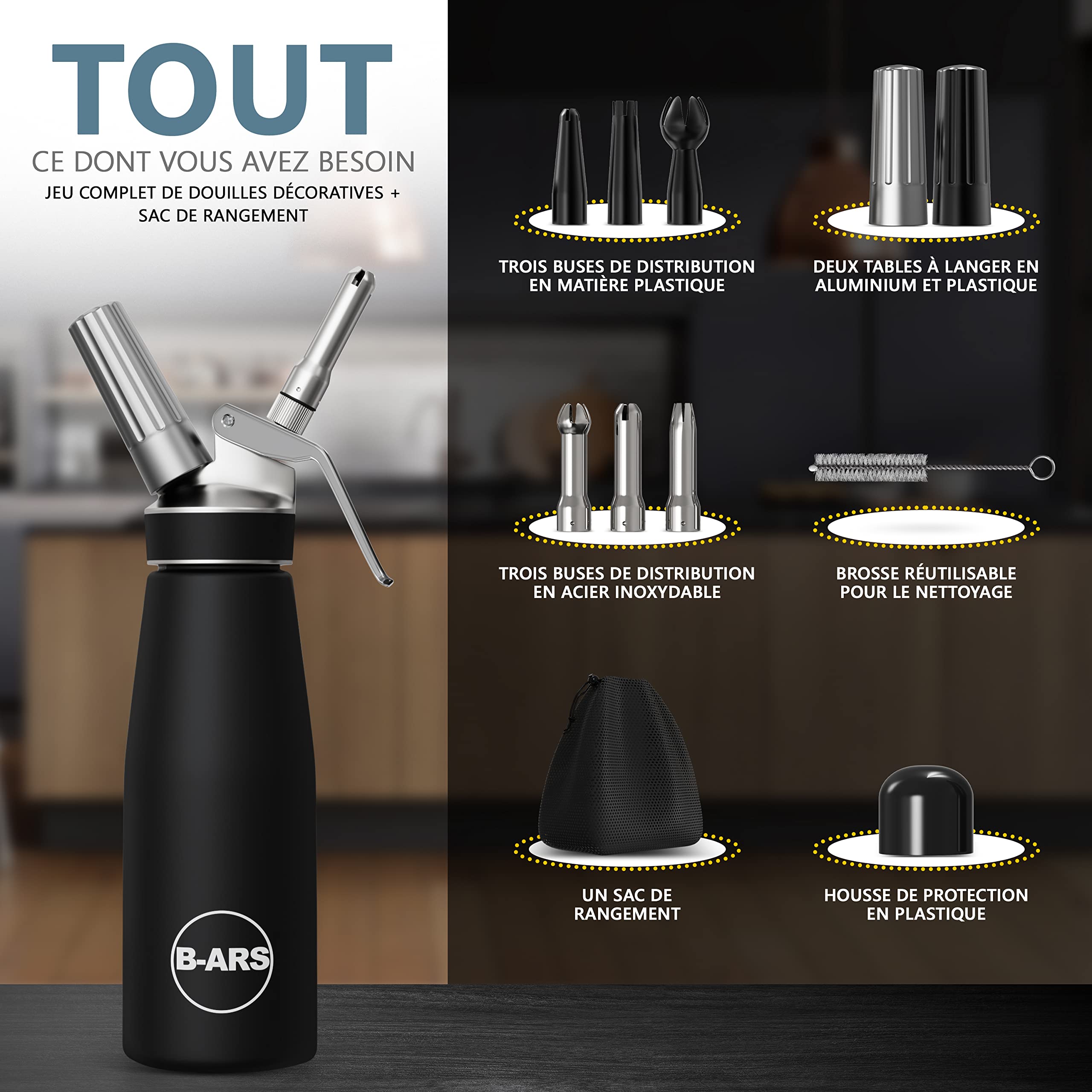 Kit Décoration Mousses Et Crèmes B-ARS Siphon Chantilly Professionnel-Machine A Chantilly Ustensiles Cuisine Créative Siphon Chantilly B-ARS 500ml Inox - Avec Buses Décoratives Et Livre Recettes - Pour Mousses Et Crèmes Siphon Gastronomique 500ml Ustensiles d'aide à la pâtisserie, Inox. 4 offres. à partir de18,90 €. B-ARS Buses Set de Siphon Chantilly-Aiguilles Siphons de Cuisine-Buses Machine a... L'installation et le nettoyage sont simples, vous faisant gagner du temps et des efforts en cuisine. Obtenez des textures parfaites et des présentations de qualité de restaurant à chaque utilisation, impressionnant vos invités et élevant vos plats maison à un niveau professionnel. Simplifiez la préparation de plats complexes, vous permettant de profiter davantage du temps avec vos proches. Fabriquées en acier inoxydable de qualité alimentaire, elles sont durables, résistantes à la corrosion et sûres à utiliser. ° Nettoyage et Entretien Faciles: Fabriquées avec des matériaux de haute qualité, nos douilles et aiguilles sont faciles à nettoyer, assurant une utilisation hygiénique et prolongée sans complications. ° Résultats Professionnels à la Maison: Profitez de l'expérience d'un chef professionnel dans le confort de votre foyer. Nos douilles et aiguilles permettent un contrôle précis pour obtenir des finitions parfaites à chaque préparation. Versatilité en Cuisine: Les douilles et aiguilles permettent de créer une variété de décorations et textures dans vos desserts et boissons, transformant vos...