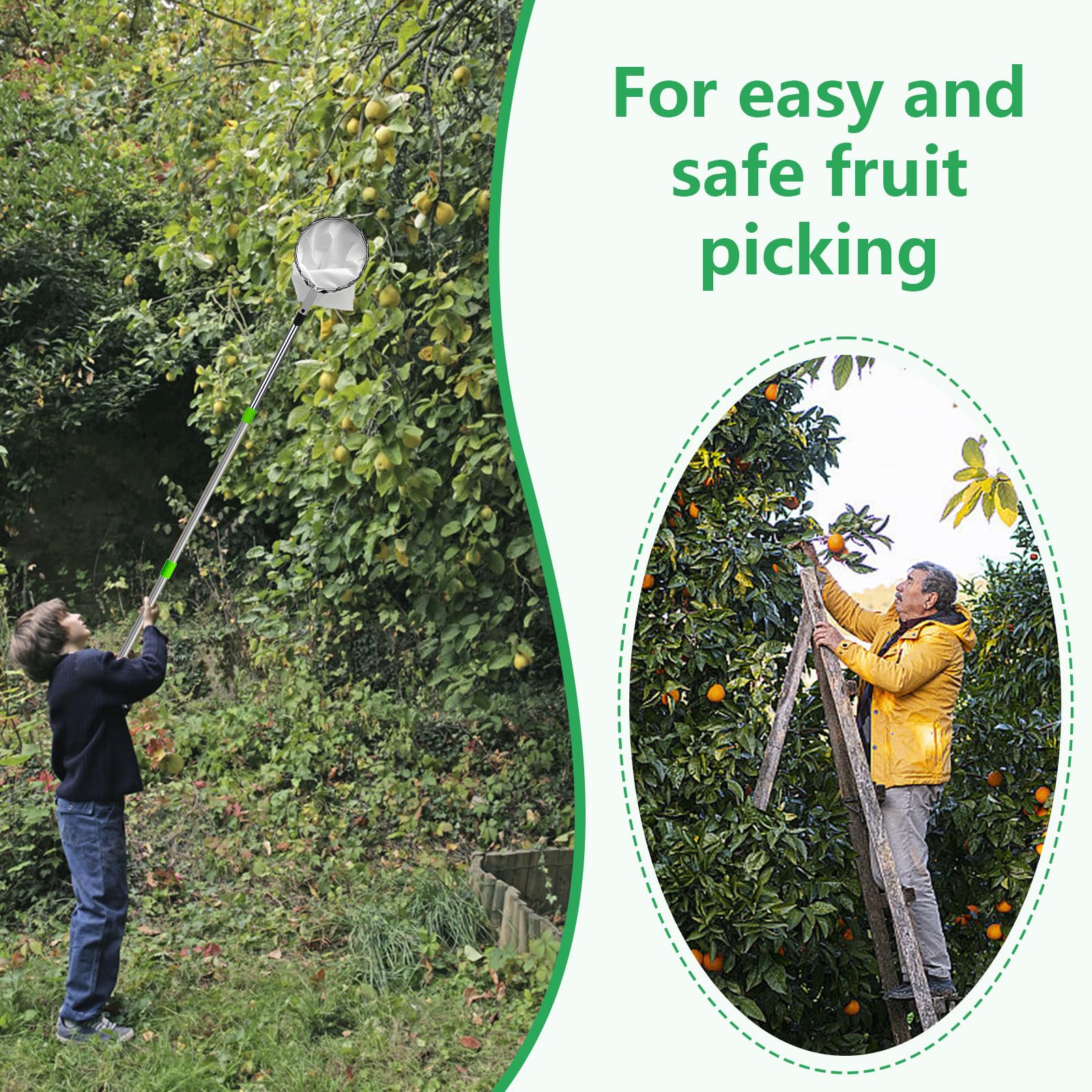 Avec notre aide à la cueillette des cerises, vous pouvez cueillir des fruits sans utiliser d'échelle. Êtes-vous toujours inquiet de ne pas pouvoir cueillir les fruits des hauteurs ? Avez-vous trouvé un cueilleur de fruits adapté, réglable en hauteur à volonté ? MININUSI Le cueilleur de fruits télescopique - avec sa perche amovible en acier inoxydable et l'utilisation d'un sac de cueillette - fait de la cueillette une expérience confortable et sûre pour les jardiniers amateurs et les producteurs de fruits professionnels. Pas facile à rouiller et durable. Assez solide pour porter ses fruits sans se déformer, se plier ou se casser. Fixez le panier au poteau avec l'ouverture du manchon vers le haut, placez le manche à fruits entre les deux dents, puis tirez fermement sur le poteau et les fruits tomberont dans la poche du cueilleur. Il y a un sac en tissu au fond et les fruits cueillis peuvent facilement tomber dans le sac, ce qui peut empêcher les fruits de se cogner ou de se casser et permettre une cueillette sans trace. Vous pouvez régler la longueur en fonction de la hauteur de cueillette, ce qui permet de gagner beaucoup de temps lors de la cueillette des fruits et vous n'avez plus à vous soucier de l'utilisation d'échelles dangereuses. La poignée de la nacelle est équipée de 5 rallonges et peut être rallongée jusqu'à 2,4 m. 【En acier inoxydable amovible et longueur réglable】 Le corps du cueilleur de pommes a un design amovible innovant et la longueur de chaque poteau est de 40 cm. Aucun dommage au fruit Le cueilleur de pommes télescopique est doté de plusieurs dents encastrées et lisses et les dents sur le bord du panier sont spécialement conçues pour éviter d'endommager les fruits lors de la cueillette. En acier inoxydable amovible et longueur réglable] Le corps du cueilleur de pommes a un design amovible innovant et la longueur de chaque poteau est de 40 cm... Le sac de rangement vert attaché a une grande capacité et peut mieux stocker les fruits. 【Outil idéal pour cueillir des fruits】 Le cueilleur de prunes est conçu pour cueillir facilement les fruits des parties supérieures de l'arbre. Amusez-vous à cueillir des fruits avec le Fruit Picker ! Cette flexibilité permet aux utilisateurs de différentes hauteurs et environnements de travail de cueillir aussi facilement qu'ils le souhaitent. 【Sûr à choisir】 Notre ensemble comprend 1 sac de cueillette de fruits, une perche de 4 pièces et 1 sac. cueille fruits avec sac Manche télescopique Cela accélère votre processus de cueillette des fruits. Outil idéal pour cueillir des fruits] Le cueilleur de prunes est conçu pour cueillir facilement les fruits des parties supérieures de l'arbre. Avec notre aide à la cueillette des cerises, vous pouvez cueillir des fruits sans utiliser d'échelle Lors de la cueillette des fruits, placez le manche du fruit au milieu des deux dents, puis tirez fermement sur la tige. Cueille Fruit Télescopique Skytowards Cueille Fruit Telescopique, Cueilleur De Fruits Avec Sac Pommes Manche Telescopique Diametre 16 Cm Cerises Prunes Pince A Pour 1073225767 Perche A Fruit La poignée est confortable à tenir et vous permet d'économiser de l'énergie lors de la cueillette. Les fruits tombent dans le sac, évitant ainsi le danger de grimper à l'arbre. Le cueilleur de fruits est facile à utiliser. Spécifications: Matériel: acier inoxydable + tissu Longueur du mât: 40 cm Tête de cueilleur (environ): diamètre - 16 cm Contenu de la livraison: 1 x cueilleur de fruits 4 x tige 1 x sac vert Il peut être utilisé à la maison, dans les fermes, les parcs et les jardins.