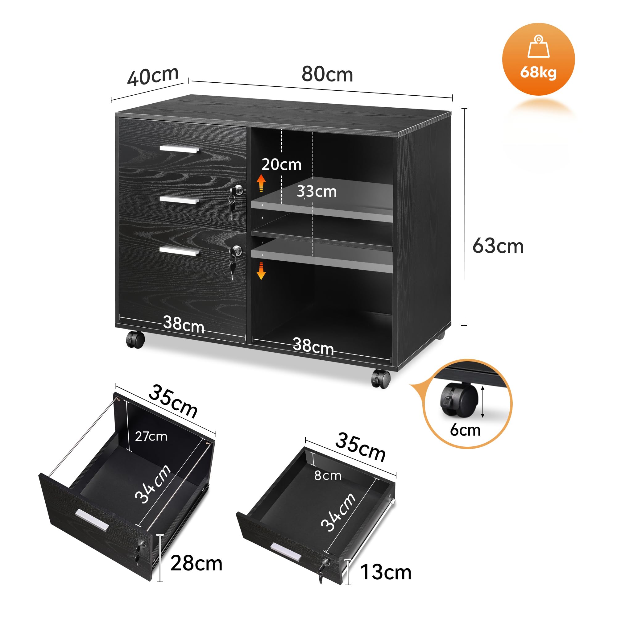 SoBuy ASK05-W Caisson De Bureau Support Imprimante Roulant Organiseur Bureau Mobile Caisson Avec Tiroirs Et Compartiments Meuble De Rangement Bureau Blnac 58x35x59 Cm 85595458 Surface Robuste & Imperméable : Fabriqué avec une finition anti-rayures et imperméable, facile à nettoyer pour une apparence durable. Meuble Sous Bureau Design Rétro Blanc SoBuy Caisson De Bureau à Roulettes, Support Imprimante Roulant, Organiseur Bureau, Meuble De Meuble Bureau Un meuble bureau rangement qui s'intègre harmonieusement à tout espace. Equipé de 3 tiroirs, de 2 niches et d'un grand plateau, vous pourrez y ranger tout votre matériel d'impression et accessoires (imprimante, feuilles, stylos... Avec 3 tiroirs en tissu (dont un pour classeurs A4), une étagère ouverte pour imprimante ou décorations, et 4 roulettes (2 bloquantes). Style industriel élégant... Montage Simple & Rapidité : Ce meuble pour imprimante s'assemble facilement grâce à des instructions claires et des pièces étiquetées. Mobilité Adaptable : Équipé de 4 roues dont 2 roulettes bloquables, ce caisson de rangement roulant se déplace aisément et se fixe solidement. Sa construction durable assure stabilité et fonctionnalité à long terme - un meuble de bureau essentiel et fiable. La grande surface du plateau devient une zone d'exposition. Parfait pour les espaces dynamiques nécessitant un meuble bureau mobile. Un meuble sous bureau parfait pour gagner de place.