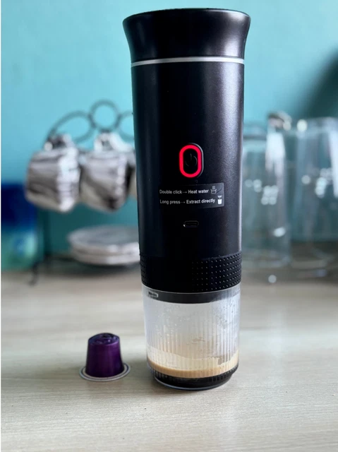 H4a Machine à Café Portable Pour Voiture 80 W, Cafetière Expresso 3 En 1 Blanc 【Facile à transporter】 Ce expresso portable ne pèse que 500 grammes, rentre dans la poche latérale d’un sac à dos et est robuste. Cafetière Camping Sans Fil Sobtoe Machine à Expresso Portable, Machine à Expresso électrique Portable Auto-chauffante, Mini Cafetière De Voiture 12 V 24 V Avec Dosettes NS Et Café Moulu Pour Voyage, Camping, Bureau, Maison Machine Café 15 Bars Voyage 【Fonctionnement intuitif】 Toutes les fonctions de notre cafetière portable ne nécessitent qu’un seul bouton : Appuyer une fois légèrement pour activer l’écran ; maintenir enfoncé pendant 3 secondes pour que l’appareil chauffe l’eau à 90 degrés puis extraie ; double clic pour extraire directement sans chauffage. La CONQUECO portable : chauffe automatique en 2-3 min , compatible capsules Nespresso OU café moulu , batterie rechargeable pour jusqu'à 8... Machine À Café Capsules, Cafetières À Dosettes, 20 Bars De Pression... Non compatible avec les capsules Nespresso Vertuo et Abgebildeten. Il est facile à transporter, idéal pour les voyages, le camping, les voyages en voiture ou le bureau – une parfaite machine à café portable. 【Remarque】 Lors de l’usage du mode de chauffage, la sortie du café et le carter de l’appareil peuvent être chauds. Ce cafetiere capsule peut préparer 4 tasses de café avec de l’eau froide chauffée ou plus de 50 tasses de café sans chauffage actif. Il est compatible avec les capsules Nespresso Original et Dolce Gusto. 【Grande autonomie de batterie】 Notre machine a cafe portable est équipé d’une batterie de 7800 mAh, facile à utiliser n’importe où et à n’importe quelle heure.