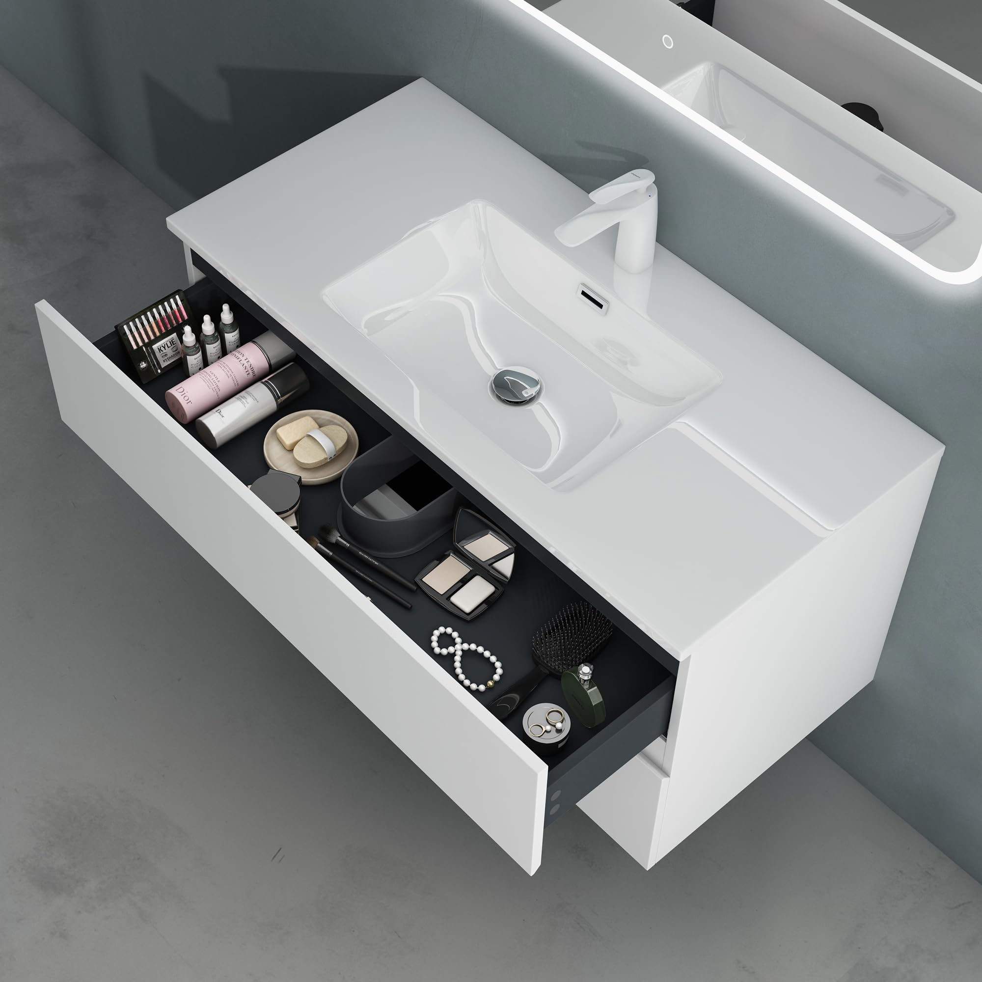Montage simple avec raccords DIN ; la robinetterie n'est pas comprise dans la livraison. Meuble Mural Salle De Bain Moderne Doporro Sogood Meuble De Salle De Bain Suspendus Blanc | WhichOne Meuble Rangement MDF Laqué Matériau de haute qualité Description du produit Ensemble de meubles de salle de bains un meuble sous vasque et une vasque avec 1 per age de robinetterie Type de bois panneaux MDF laqu s Surface imperm able du meuble bas Tiroirs avec fonction soft-close 2 tiroirs avec beaucoup d'espace de rangement conomisez de l espace pour ranger soigneusement les serviettes, les cosm tiques et les produits d hygi ne Montage simple... Ensemble de meubles de salle de bains : un meuble sous vasque et une vasque avec 1 perçage de robinetterie Dimensions : 100x48x56 cm ; Couleur : blanc | Lavabo en fonte minérale : Largeur : 100 cm ; Couleur : blanc Sogood Meuble de Salle de Bain Suspendus Blanc 60x42x50cm Ensemble de 2... Glissières de haute qualité Les glissières en acier inoxydable assurent une ouverture et une fermeture en douceur des tiroirs et sont réglables en fonction de l'orientation. Grand espace de rangement Le meuble bas vous offre un espace de rangement suffisant : ici, vous pouvez ranger serviettes, cosmétiques et articles d'hygiène de manière peu encombrante. Type de bois : panneaux MDF laqués | Surface imperméable du meuble bas | Tiroirs avec fonction soft-close Meuble salle de bain design double vasque SIENA largeur 144 cm, blanc – Le Monde du Bain Tiroirs Soft-Close Les deux tiroirs de ce meuble de salle de bains ont une fonction soft-close. 2 tiroirs avec beaucoup d'espace de rangement : économisez de l’espace pour ranger soigneusement les serviettes, les cosmétiques et les produits d’hygiène