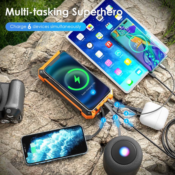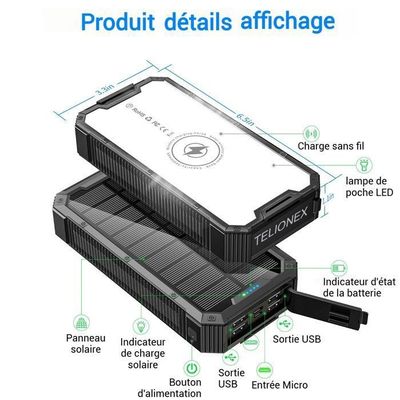 Ne pèse que 413 g et avec un mousqueton pour l'accrocher aux sacs à dos, il est compact et portable à transporter, parfait pour le camping, la randonnée et le vélo. Batterie Externe Solaire Avec Briquet Lumineux Et Lampe De Poche LED 10 000 Mah 83706216 Batterie Secours Plein Air Batterie Externe Solaire, Aomdom 26800 MAh Batterie Solaire Charge Rapide Et 15 W Sans Fil Avec Powerbank 32000 MAh Solaire Il prend en charge le chargement sans fil et peut charger tous les téléphones mobiles prenant en charge la technologie de chargement sans fil Qi. Il prend également en charge l'entrée de type C et peut être complètement chargé en 8 heures. Batterie Externe Solaire 24000Mah, Qi Sans Fil Chargeur Solaire 2 Ports... 【Chargement solaire et chargement par câble】avec des panneaux solaires très efficaces, la chargeur solaire peut convertir la lumière du soleil en énergie électrique avec un meilleur effet. (Remarque : la recharge solaire est destinée à une utilisation d’urgence, ne prenez pas l’énergie solaire comme source de recharge principale) 【Compagnon d'extérieur parfait】 le chargeur solaire pour telephone peut ajuster automatiquement la sortie pour fournir le courant le plus approprié afin de fournir plusieurs protections pour les appareils, telles que la protection contre les surtensions, les surintensités et les courts-circuits. Il dispose de type C, de 3 ports de chargement USB et d'un chargement sans fil, qui peut charger 5 appareils en même temps et fonctionner avec la plupart des appareils.