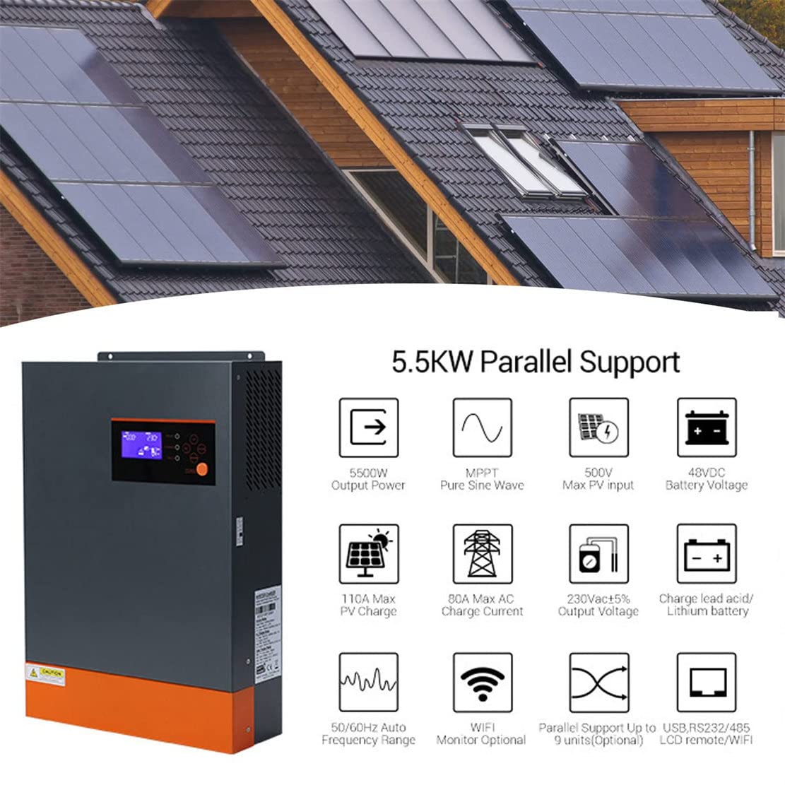 Système Solaire Hors Réseau Onduleur Solaire Hybride 1.0-10.2 KW Chargeur à Onde Onduleur Onde Sinusoïdale Pure Solaire Un onduleur hybride est un appareil qui permet de transformer le courant continu de vos panneaux solaires en courant alternatif, ce qui permet de l'utiliser pour votre maison. De plus, il détermine de façon autonome si l'électricité produite doit être utilisée, stockée ou injectée dans le réseau Onduleur Hybride Solaire Liative Un Power, 12v, Ac 220v, Feckw, Onde Sinusoïdale Pure, 80a ; Exécute Home / Office AC Loads Refrigerator, TVS, Fans, etc. Onduleur à Onde sinusoïdale Pure Automatique 2500W - 3000W - 4000W... (Évitez l'installation de la chambre: le bruit du ventilateur de 50 à 70 dB peut perturber le repos) 【4 Modes de charge】 L'onduleur solaire hors grille a 4 modes de charge sont facultatifs, c'est-à-dire seulement l'énergie solaire, le frist secteur, le FRIST solaire et la charge hybride solaire; 3 Modes de sortie: Solar Frist, Mains Frist et SBU Priorité, garantissant une puissance ininterrompue L'alliage d'aluminium de haute qualité avec dissipation de chaleur poreuse résiste à la surchauffe pendant les longues courses, assurant la fiabilité et la longue durée de vie ►Pure Onduleur solaire à onde sinusoïdale avec contrôleur de charge solaire MPPT + chargeur AC, écran LCD, gamme de tension MPPT Array MPPT 60-450VDC ►Features √Output Power Facteur Sy2., 0K = 0,8 / Sy3,2k 0,9 √vable pour I0S et Android WiFi et GPRS √ Charger solaire 80AMPPT √panel Plage de tension d'entrée (30 ~ 400VDC) √ kit de poussière constante, adapté aux environnements difficiles √ conception de charge de batterie indigeante, optimiser la durée de vie de la batterie √ compatible avec les batteries au lithium L'énergie solaire est fournie d'abord à la charge ► spécifications - Nom du produit: onduleur solaire à onde sinusoïdale pure - Forme d'onde: onde sinusoïdale pure - Tension d'entrée: 12V, 24V, 48V - Tension de sortie: 220V - Courant de charge solaire maximum: 40A / 80A / 120A / 160A - Type de batterie externe: batterie d'acide au plomb / au lithium - Power: 1000W, 2000W, 1500W, 3200W, 4200W, 6200W, 8200W, 10200W ► Liste des effectifs 1 * onduleur solaire hybride