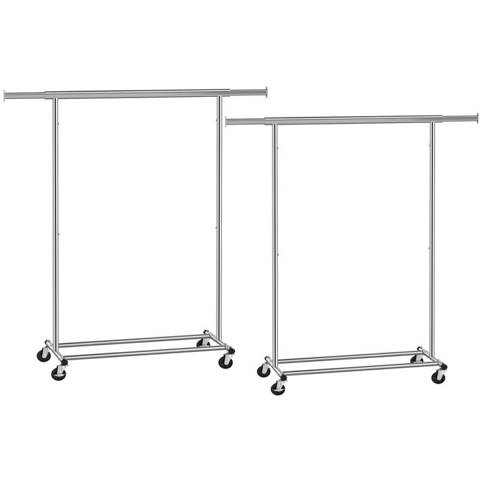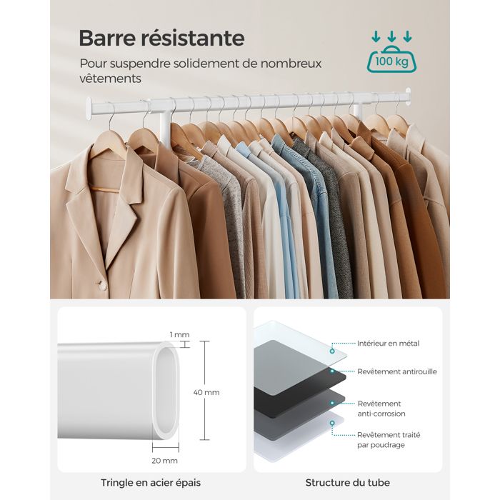 Polyvalent : Il sera utile dans votre chambre pour un usage quotidien, dans votre buanderie pour accrocher des cintre, ou à l'extérieur grâce au métal traité par poudrage Porte-manteau Mobile Capacité 150 Kg Songmics Portant à Vêtements Avec Roulettes, Lot De 2, Tringle Portant Tringle Extensible 160-200cm SONGMICS Dimensions : 45 x (160-200) x 161,5 cm (P x L x H), Poids : 6., 2 kg Polyvalent] Ce porte-vêtements peut être utilisé pour suspendre des vêtements dans votre chambre, salon ou buanderie pour sécher des vêtements. Vous pouvez ranger vos chaussures en bas et l'utiliser en extérieur grâce au métal chromé Ce portant supporte jusqu'à 150 kg Tringle téléscope pratique : La barre peut être rallongée de 20 cm. Grâce aux 4 roulettes industrielles robustes en PP, dont 2 avec freins, ce porte-vêtement peut être déplacé ou bloqué sur place facilement. 1. Robuste et... Capacité de charge améliorée : La paroi des barre en acier est de 1 mm (plus épaisse que les modèles classiques de à 0,8 mm) et les roulettes en PP sont résistantes. Capacité de charge statique maximale : 150 kg Voici plus d'espace pour suspendre vos sacs, chapeaux, écharpes et autres accessoires Portant amovible - SONGMICS - Portant à Vêtements avec Roulettes Ne tenez pas la tringle pendant que vous poussez pour éviter de vous coincer les doigts. Facile à déplacer et à verrouiller : Ce porte-manteau est équipé de 4 roulettes pivotantes à 360°, dont 2 avec freins, facile à déplacer et à rester sur place