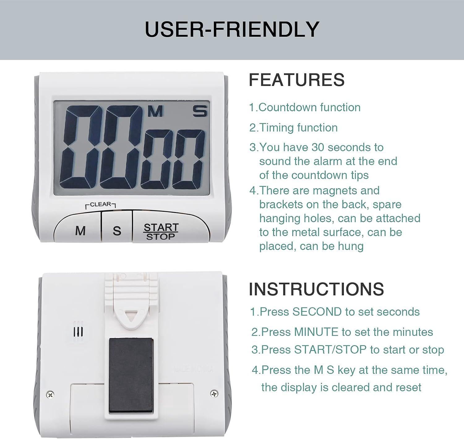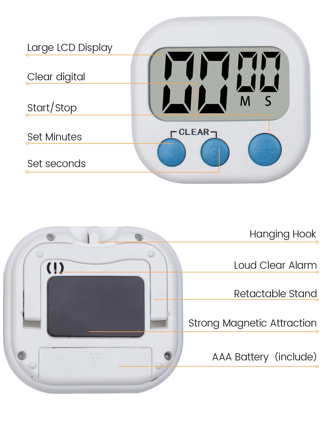 Grand minuteur LCD avec alarme. Type de plastique : polyéthylène. Écran LCD : 60 x 28 mm., Couleur : noir. Dimensions : 75 x 70 x 25 mm (environ). Avec un réglage maximum de 24 heures, ce minuteur polyvalent s'adapte parfaitement à votre routine quotidienne pour tous vos besoins de synchronisation. [Minuterie polyvalente] : ce minuteur numérique LCD magnétique dispose à la fois de fonctions de compte à rebours et de compte, parfait pour suivre les temps de cuisson, les jeux ou toute activité chronométrée. Alarme Forte Minuteur Sonnerie Forte Minuteur Cuisine Français - Écran LCD Numérique - Support Inclinable Et Magnétique - Garantie 5 Ans Minuteur Français Garantie 5 Ans Minuteur Magnétique Pourquoi vous avez besoin d'une minuterie de cuisine – ThermoPro Type de minuteries : minuteurs numériques., Aspect : commun. Fonctionne parfaitement en relation avec la cuisine, les jeux chronométrés, les activités de planification, les rappels, et plus encore. Plusieurs options de montage : conçue pour plus de commodité, cette minuterie est livrée avec un support pliable, un support suspendu et un dos magnétique. Mur magnétique grande cuisine numérique oeuf cuiss... – Grandado Fonction : réglage de l'heure. [Fonction alarme puissante] : ne manquez jamais lorsque le temps est écoulé. Plus besoin de plisser les yeux ou de vous rapprocher pour vérifier l'heure, ce minuteur vous tient informé d'un simple coup d'œil. Facile à lire : grands chiffres sur un écran LCD de 6,6 x 3,5 cm; Caractéristiques : interrupteur d'alimentation, boutons avec marquages clairs pour une... Placez-le sur votre plan de travail, fixez-le à votre réfrigérateur ou accrochez-le au mur - Options de positionnement pour s'adapter à n'importe quelle configuration de cuisine. La puissante alarme peut être entendue même depuis une autre pièce, ce qui rend cette minuterie fiable pour les étapes de cuisson importantes, les activités en classe ou les intervalles d'entraînement lorsque vous pourriez vous éloigner momentanément. Caractéristiques : Certification : CE/EU.