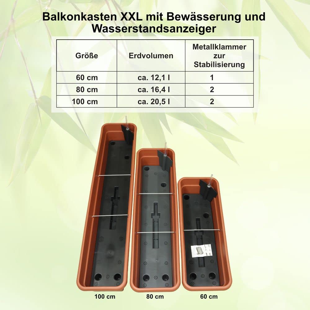 Indicateur de niveau d'eau + un dessous de verre XXL assorti 97 cm - coloris : anthracite Jardinière Balcon XXL 100cm MePla - Balcony Jardinière De Balcon 100 Cm + Soucoupe – Anthracite – Bac à Fleurs – Pot à Plantes – Bac à Plantes En Plastique Résistant Aux Intempéries Et Aux UV Jardiniere Hauteur 100 Cm Matériaux de qualité supérieure Notre kit se compose de la jardinière de balcon XXL avec irrigation et du soucoupe assorti, est fabriqué en plastique de qualité supérieure. Gabiona - Gabion à monter en longueur 100 cm x 100 cm x 50 cm (L x H x... Ainsi, les caisses restent indéformables même en cas de températures estivales et vous apporteront beaucoup de plaisir. Y COMPRIS LE STOCKAGE DE L'EAU : Le stockage d'eau intégré assure un apport d'humidité optimal et durable aux plantes. Bac à fleurs en acier, carré de jardin empilable, 120x120x43 cm, pour légumes, herbes, plantes, résistant aux intempéries, pour balcon et terrasse. Vendu... Résistance maximale Pour toutes les jardinières de balcon XXL, des pinces métalliques sont également fixées dans le bord supérieur. Arrosage optimal Un grand réservoir d'eau intégré permet un approvisionnement optimal et durable des plantes en humidité. Le réservoir d'eau peut être rempli dans la zone de remplissage située dans le coin de la boîte. Gabiona - Gabion à monter en longueur 100 cm x 30 cm x 40 cm (L x H x P Un indicateur de niveau d'eau est inclus dans la livraison. ARROSAGE OPTIMAL : Si trop d'eau a été remplie, elle s'écoule vers le bas via les dômes de trop-plein du bac et est collectée dans la soucoupe fournie.