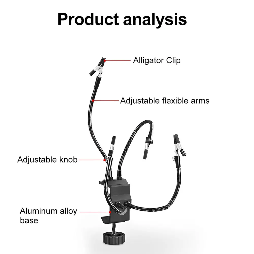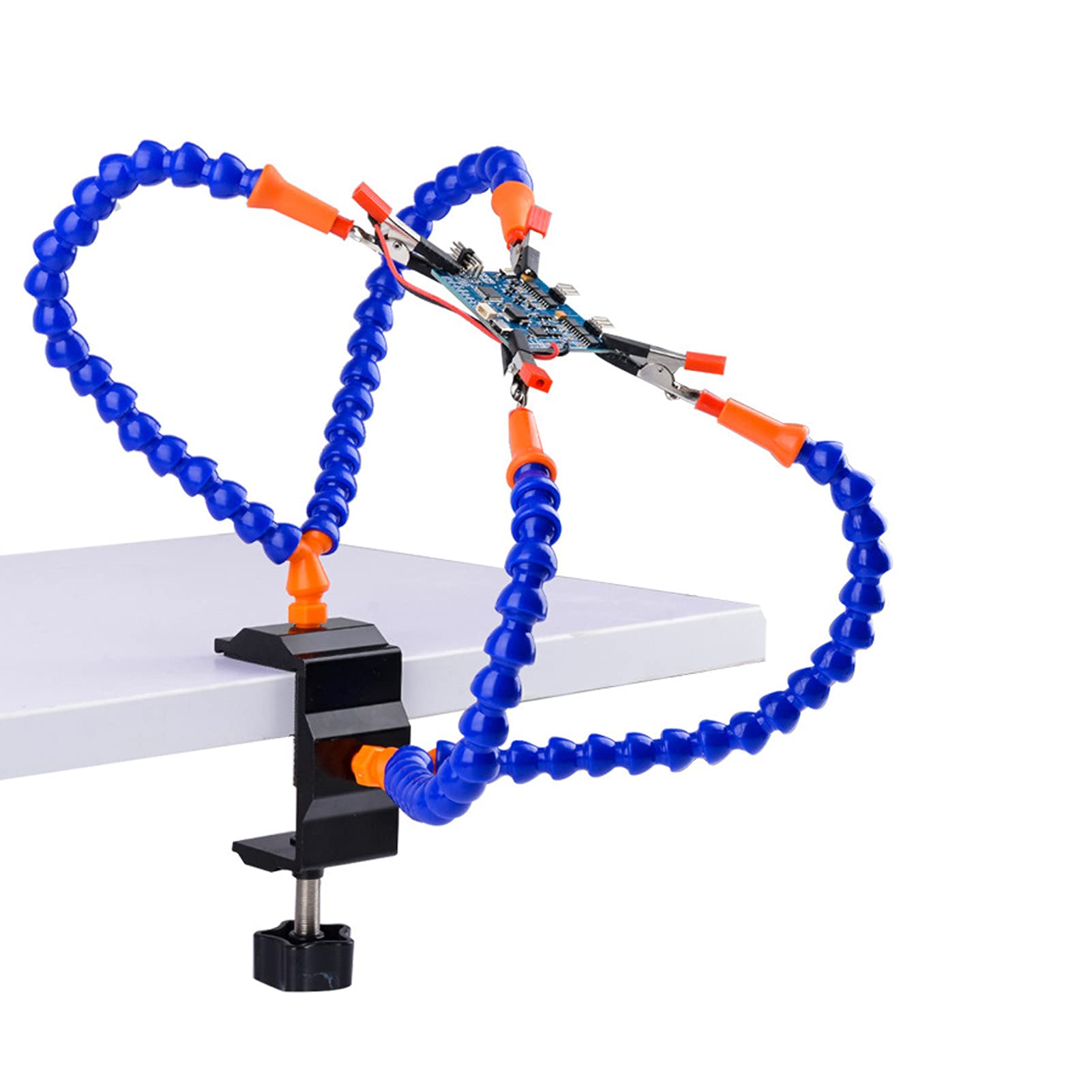 Accessoire Atelier électronique Diy Banc Étau Pince Station De Soudage Avec 3pc Bras F... – Grandado Bras Flexible Soudage NEWACALOX – absorbeur de fumée de soudure 30W EU/U... – Grandado Cikonielf station de soudure à 3 bras Pince de Station de Soudure... Élimine la frustration des mains traditionnelles., 5., Parfait pour les tableaux d'ordinateur, les fabricants de bijoux, les loisirs créatifs, les travaux de soudure, il peut être utilisé universellement. Contenu : 1 base en alliage d'aluminium. 2 tuyaux de jonction universels., 2 pinces crocodiles. Caractéristiques : 1., Pinces crocodiles rotatives à 360 degrés, puis « » verrouillées » en place avec des écrous moletés., 2., Base en alliage d'aluminium, avec coussinet en caoutchouc souple noir. Le design de cette base est un type de pince de table, les vis peuvent être ajustées, et il peut être fixé de manière stable sur la table. Les pinces crocodiles peuvent tenir votre projet et pivoter à 360 degrés, ces pinces crocodiles sont isolées et ne rayent pas. Contenu de l'emballage : 2 bras flexibles + 2 pinces crocodiles + base antidérapante en aluminium, facile à utiliser et à transporter. 2 bras universels réglables : la station de soudure se compose de 2 bras réglables, qui sont robustes, flexibles et faciles à utiliser. 2 mains d'assistance flexibles, tube de joint universel, peut être facilement positionné où vous le souhaitez