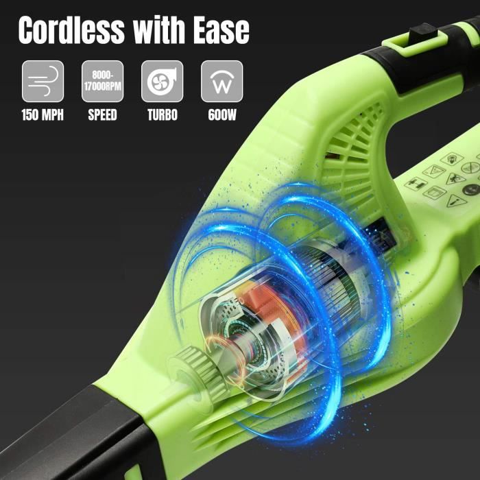 Souffleur De Feuilles 21V Souffleur Batterie, Souffleur à Feuilles Souffleurs De Feuilles Souffleur Jardin Léger 3.5 Lb Souffleur De Feuilles Sans Fil Batterie 21V Souffleurs De Feuilles Avec Souffleur de feuilles sans fil - 2 batterie et chargeur - 3 vitesses - 3 buses de soufflage - 21V Composition du lot : 1 x souffleur de feuilles, 2 x piles, 1 x chargeur, 1 x manuel d’utilisation en anglais 【🪶 Ultra-léger 3,5 lb - Utilisation facile d’une seule main ! 】 La conception légère de la poignée ergonomique en caoutchouc réduit la fatigue de 30 % 🖐️ Nettoyez les allées, les patios et les plates-bandes sans effort ! 【💨 150MPH Turbo Wind - Soufflez les débris coriaces ! 【🔋 Double alimentation par batterie - plus de temps d’arrêt !, 】 2x batteries 21V/2., 0Ah pour un nettoyage ininterrompu ! 】 La technologie avancée de la turbine souffle les feuilles mouillées, les brindilles et la saleté sans 🌪️ effort Plus de maux de dos dus au ratissage - laissez le souffleur faire le travail ! 【⏱️ Indicateur LED de charge rapide de 1 heure】 Feu rouge = en charge, vert = prêt ! ⚡ Charge complète en 60 minutes - n’attendez plus jamais que les batteries soient déchargées ! Marque. EagerMinds ; Couleur. noir-1 Batterie ; Source d'alimentation. Alimenté par pile ; Composants inclus. Batterie, Chargeur, Sac collecteur, Tube à vide ; Nom...