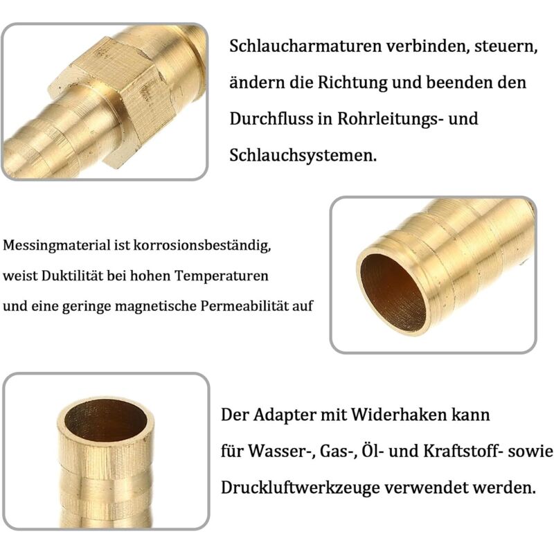 sourcing map Raccord de tuyau cannelé en laiton, 10 mm cannelé x - Convient pour raccorder des outils pneumatiques, permettant un raccordement rapide et pratique de l'air, de l'eau, du carburant et d'autres fluides. Raccord Laiton Filetage Interne 10 Mm Sourcing Map Lot De 2 Raccords Cannelés Droits En Laiton Pour Tuyau D'air, Gaz, Eau, Carburant, 6 Mm Raccord Tuyau 10mm - Il suffit d'insérer le tuyau dans le filetage interne et de tourner la bague filetée pour terminer l'installation. Raccord Cannelé Tuyau Coude Laiton Barbelé Tube 14mm x G1-2 Femelle... Embout de coupleur RS PRO, Tuyau cannelé vers Mâle 8mm en Laiton... Large gamme d'applications : les raccords de tuyaux en laiton conviennent à divers fluides tels que l'eau, l'air, l'huile, le gaz naturel ou le carburant. Spécifications du produit : 4 raccords de tuyau en laiton, spécification du filetage interne : G1/2 (environ 18,6 mm), adapté à un diamètre intérieur de tuyau de 10 mm. Si vous avez des questions, n'hésitez pas à nous contacter, nous vous répondrons dans les 24 heures. - Après avoir inséré le tuyau, il est recommandé de le fixer à l'aide d'une bague de serrage métallique afin d'améliorer l'efficacité de l'étanchéité. Facile à utiliser : il suffit de visser le tuyau dans le filetage interne (si le tuyau est trop petit pour être installé, trempez-le dans de l'eau chaude pendant quelques secondes pour le ramollir). Caractéristiques : - Avant de raccorder le filetage, il est possible d'installer un ruban d'étanchéité ou une bague d'étanchéité afin d'améliorer les performances d'étanchéité.