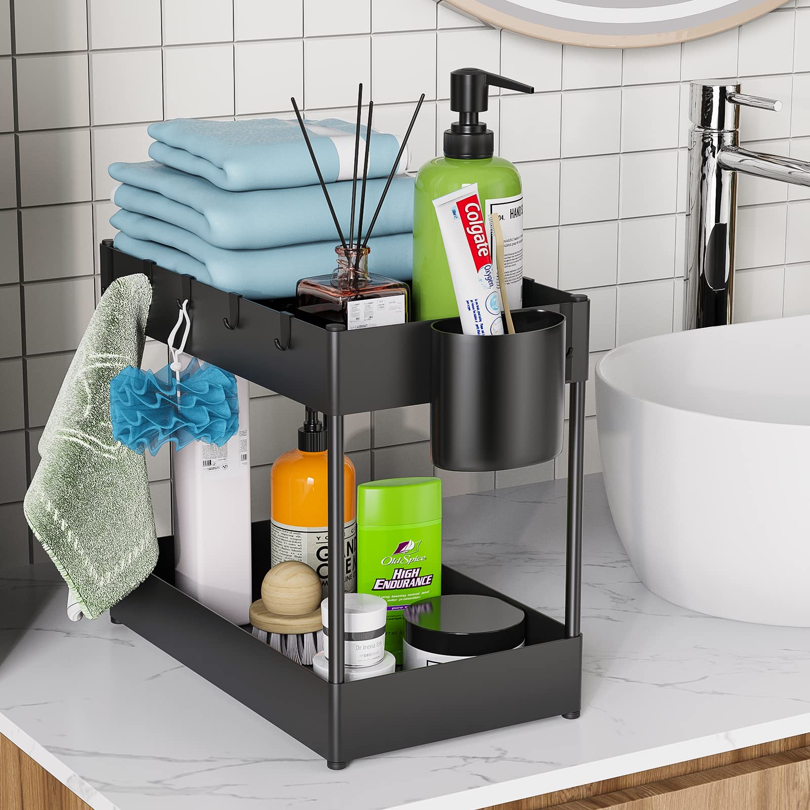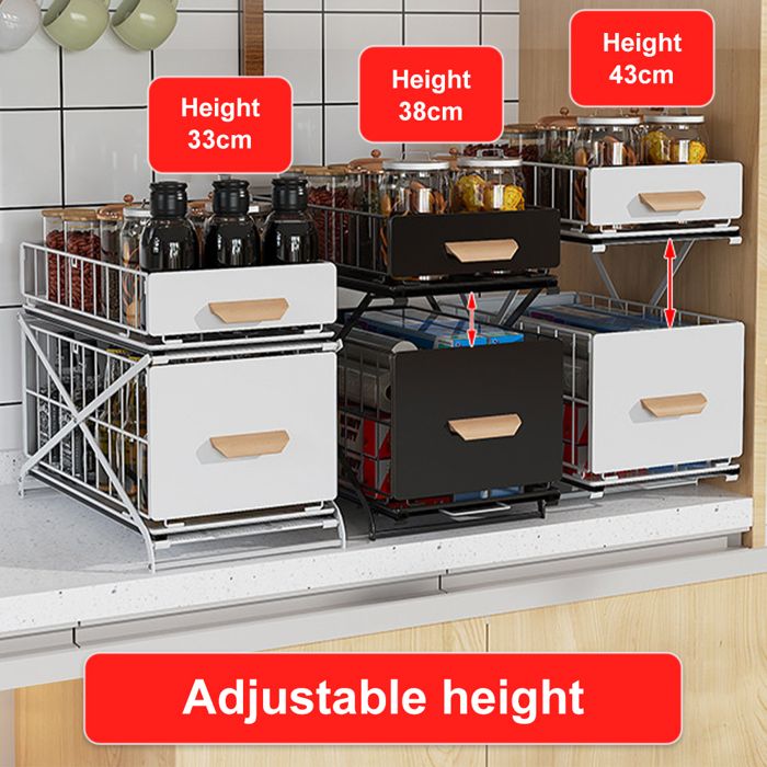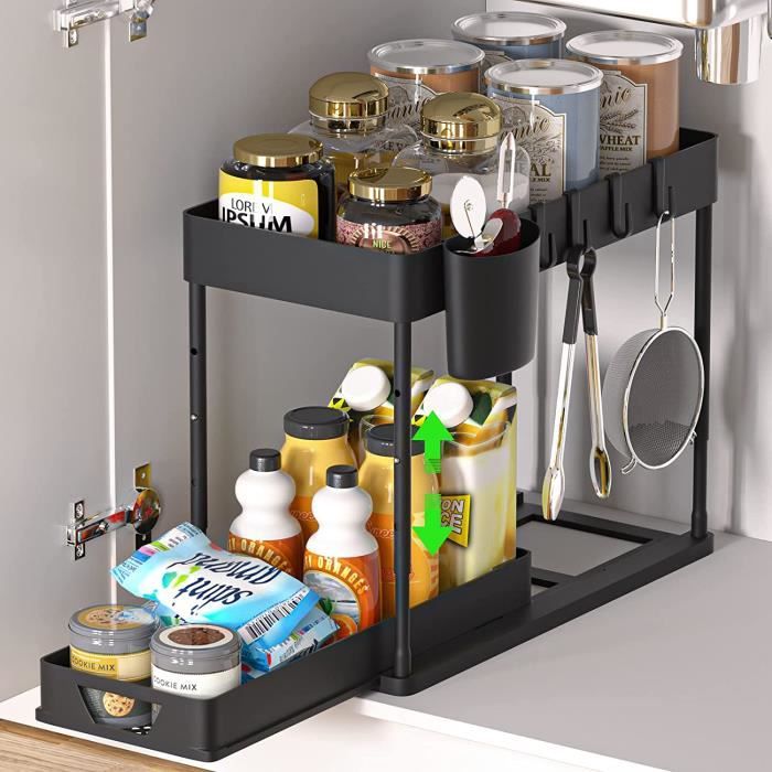 Panier inférieur : 39,8 cm L x 28 cm W x 6,5 cm H. Conception coulissante à 2 niveaux pour un accès facile : Ce système d'organisation pour garde-manger est doté d'un design coulissant à 2 niveaux fluide, permettant d'atteindre facilement les articles rangés à l'arrière sans avoir à se pencher ou s'agenouiller. Robuste et durable : Fabriqué en ABS de haute qualité et construit avec de l'acier au carbone de première qualité et une structure renforcée robuste, cet organisateur d'armoire supporte jusqu'à 28 kg, offrant un rangement fiable pour vos articles. Grand espace de rangement : Panier supérieur : 38,3 cm L x 16,3 cm W x 5 cm H. Parfait pour maximiser l'espace dans les cuisines, les garde-manger, les salles de bain, les buanderies, les garages, les bureaux et plus encore, il vous aide à maintenir une maison sans désordre et efficace. Son système de drainage intelligent évite l'accumulation d'eau, et il peut être nettoyé facilement avec un simple coup d'essuyage. Non adapté aux armoires avec des bords ou des rebords surélevés. FAKEEP Lot de 2 Rangeent sous Evier,Étagère sous Évier avec 8 Patères et 2 Vasques Suspendues... Polyvalent pour plusieurs espaces : Ces tiroirs coulissants à 2 niveaux pour armoires maintiennent vos armoires, plans de travail et zones de rangement ordonnés et organisés. HOMIEE Organisateur Sous Evier Cuisine Lot de 2 Rangement Sous Évier 2 Étages Rangement Et Organisation pour Cuisine, Buanderie, Meuble, Salle de Bain Idéal pour organiser les produits de nettoyage ou les articles de toilette, c'est également une excellente solution pour les organisateurs et rangements de salle de bain, assurant que tout est à portée de main. Organisateur Sous Evier Cuisine SKYSER Rangement Sous Evier 2 étages, Avec 4 Crochets, 8 Tiroir Coulissant Rangement Coovee Rangement sous Évier Cuisine, Lot de 2 Organisateur sous Evier Tiroir Coulissant à Cela garantit une stabilité accrue pour votre organisateur d'évier de cuisine.