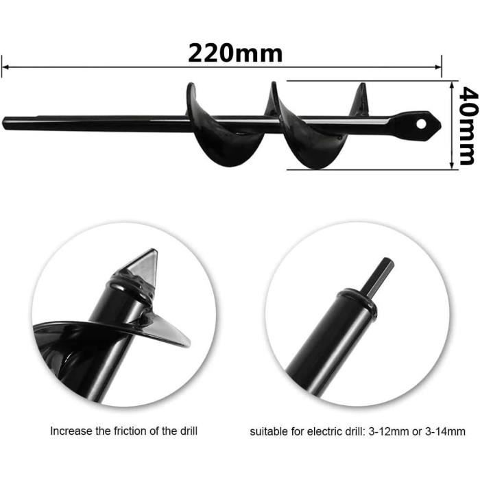 Large Application : les outils de jardinage sont un choix professionnel pour les concepteurs de jardins, ils simplifient les tâches de forage et conviennent pour creuser des trous, ameublir le sol, désherber les racines et toutes les plantes du jardin. Tarière Hexagonale Pour Perceuse Mèche Pour Tarière Jardin Tarière Forets De Jardin En Spirale 9x60cm Outil De Plantation Pratique Pour Faire Rapidement Trou Et Planter Des Fleurs Arbres Arbustes 82253922 Accessoire Jardinage Professionnel Spécifications : Matériau : métal peint, revêtement de peinture de haute qualité qui empêche la rouille. Tariere Pour Perceuse - VEVOR - forets à tarière pour plantation, lot... Dimensions : 9 x 40 cm (3,54in x 15,75in). Ce petit foret de sol convient aux trous petits et peu profonds. SINRAOEE Outil de jardin manuel manuel en spirale Foret de perçage de poteau : : Terrasse et JardinTarière manuelle, respectueuse de l'environnement, solide et résistante à l'usure, peut fournir une longue durée de vie. Écrou papillon, installation facile, ferme et stable. Pointe ronde en acier moulé, facile à brancher et aide à améliorer l'efficacité du travail. Équipé d... Matériau de Qualité Supérieure : tarière manuelle fabriqué en acier robuste, durable et résistant, sa finition de peinture noire lisse rend le grand foret de cultivateur moins sujet à la rouille. Dimensions : 9 x 40 cm (3,54in x 15,75in) Couleur : noir Caractéristiques : support en acier laminé à froid, surface durable et antirouille. Efficace : conception en spirale tariere, creuse le sol facilement, perce en quelques secondes seulement, utilisez une perceuse à basse vitesse dans des paysages appropriés. 4x45cm - Tarière De Jardin En Spirale, 8 Tailles, Perceuse De Terre Pour Plantation De Graines Jardiniere De Fleurs 2375297672 L Liste de Colisage : tarière de jardin 1 pièces il est recommandé d'utiliser une perceuse électrique de 18 v ou plus ; pour une perceuse sans fil, la tension recommandée est d'au moins 14v.