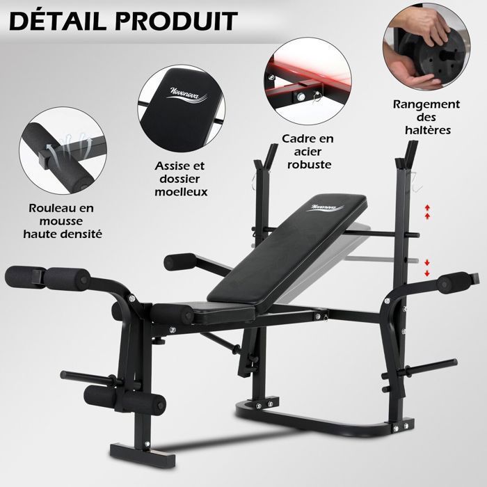 totales : 130L x 30l x 50-130H cm - Dim. Kettlebell 12kg Sportnow Banc De Musculation Multifonctionnel Avec Dossier Banc Sportnow Multifonction Contenu du colis: - 1 x Banc pour haltères; - 1 x Manuel d'assemblage; Banc d'exercice Drumfit SetUp 7000 Banc de musculation Cecotec Le coussin lisse facilite le nettoyage BANC DE MUSCULATION MULTIFONCTIONNEL : Ce banc de musculation pliant est parfait pour faire des sit-ups, rowing avec halteres, etc, vous permettant un entraînement complet (cardio, tonification musculaire) : travail de vos abdominaux, de votre fessier, de vos bras et jambes Banc de musculation - SPORTNOW - dossier réglable 5 niveaux - banc dhaltère multifonctionnel - acier revêtement synthétique noir. Ce banc de musculation... Le cadre en acier et la base antidérapante renforcent la sécurité Ce banc de musculation multifonction de HOMCOM est conçu aussi bien pour les débutants que les professionnels. GRAND CONFORT : Banc de musculation pliable avec coussin d'assise extra-large, dossier rembourrés de mousse haute densité pour un grand confort d'utilisation. Banc De Musculation Complet Banc De Musculation - SPORTNOW Le dossier réglable cible efficacement divers groupes musculaires Revêtement revêtement synthétique pour un entretien facile