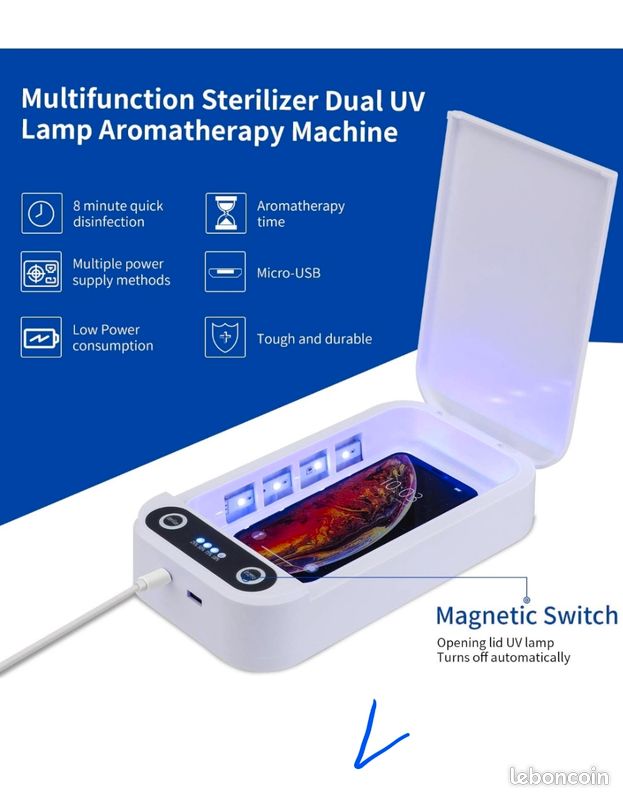 【Lumière UV】Les rayons UV éliminent efficacement et en toute sécurité les organismes nocifs invisibles, aidant à garantir votre sécurité et celle de votre famille. Phone Cleaner Machine Smartphone Boîte De Stérilisation UV Portable USB Désinfection D'aromathérapie Boîte En France Boite A Bijoux Moderne Il est alimenté par un chargeur USB pour ordinateur portable, vous pouvez nettoyer votre téléphone portable avec son étui, que ce soit au travail, à la maison, en voyage ou en voiture., (Câble USB inclus) La boîte UV peut aider à tuer jusqu'à 99,9 % des germes domestiques courants tels que le staphylococcus, l'escherichia coli et la salmonelle en 10 minutes. La boîte UV peut également fonctionner comme un diffuseur d'aromathérapie. Cadeau idéal pour vous-même et votre famille. Notre top 9 des Boîtes De Stérilisation Uv Pour Téléphone au Dimensions : 22,3 x 12,2 x 3,5 cm., Poids : 380 g. La boîte utilise des cibles de lumière UV dans les zones difficiles à atteindre. Entrée : 5 V/2 A, 9 V/2 A., Sortie : 9 V/1,1 A., Efficacité de charge : 80 %., Remarque : 1., Ne pas approcher de la flamme, de l'eau et des produits chimiques corrosifs. Grand espace d'aromathérapie : il peut être compatible avec les téléphones portables jusqu'à 6,5. Si vous avez des questions sur le produit, veuillez nous contacter à temps. Boîte de désinfection et de stérilisation UV , Por... – Grandado Boîte de stérilisation ultraviolet Portable UV Désinfectant... Caractéristiques : Taux de fonctionnement : 99,99 %. Perles de lampe UV : 8 pièces. 【Pratique à utiliser】Mettez l'article, puis appuyez sur le bouton « revêtement », il fonctionne et s'arrête automatiquement. Boîte de nettoyage UV 3 en 1 : 1., Lumière UV., 2., Charge intégrée, compatible avec iPhone et autres smartphones Android., 3., Fonctions d'aromathérapie, injectez de l'huile essentielle d'aromathérapie dans l'entrée d'aromathérapie, prenez vos téléphones ou autres articles personnels pour avoir un spa d'aromathérapie.