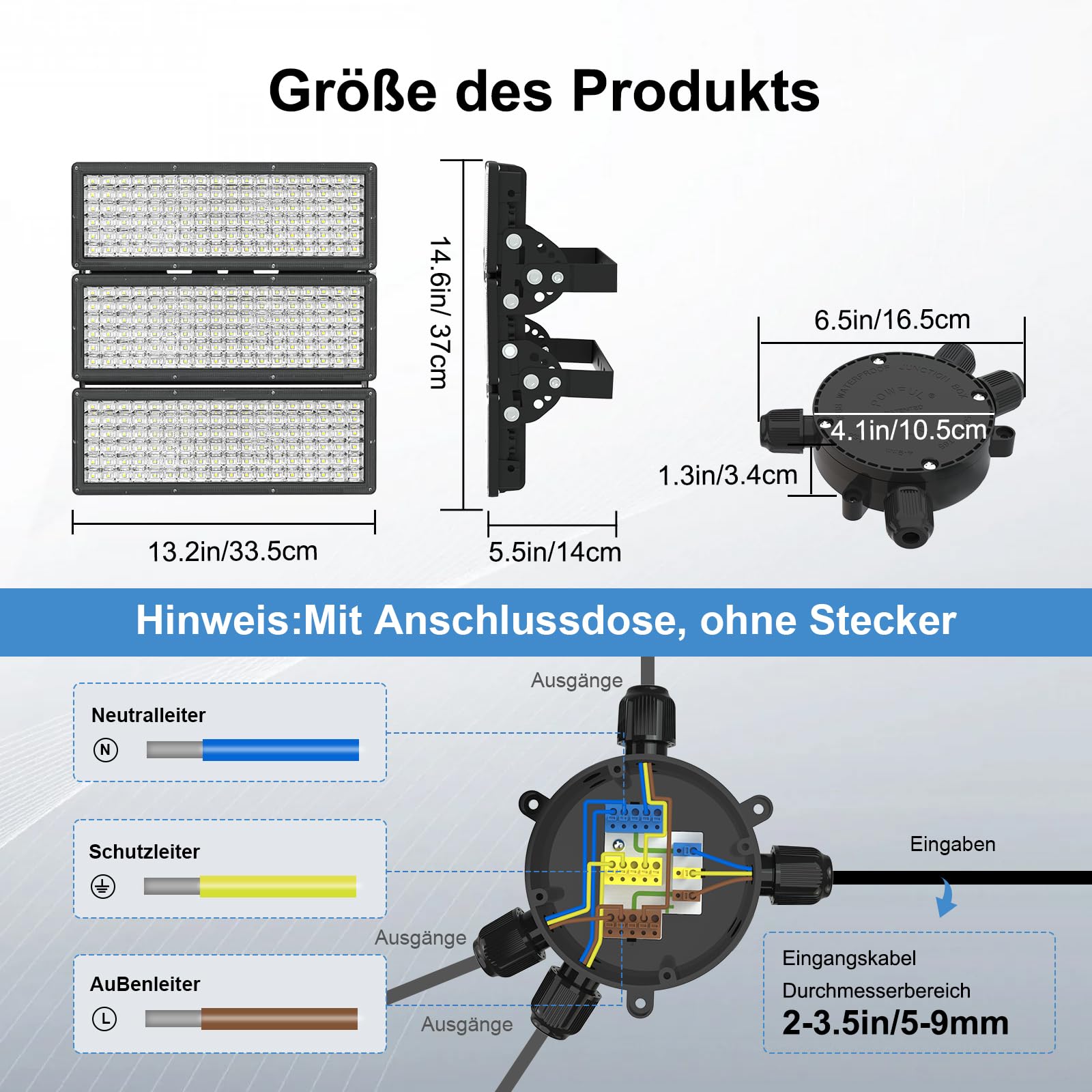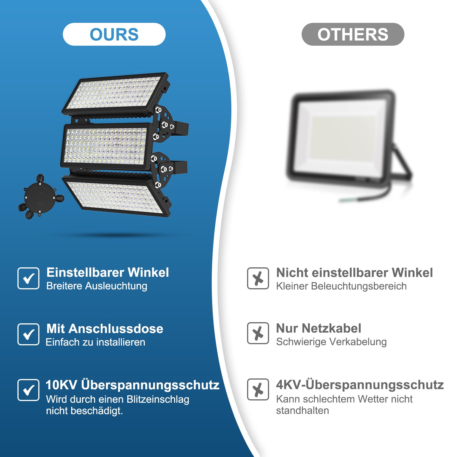Test de pluie avec projecteur Vidéo de marchand Les projecteurs conviennent à davantage de scènes Il diffuse une lumière blanc jour de 6500K, idéale pour éclairer de grandes surfaces (jusqu’à 720 m²), telles que parkings, chantiers, terrains de sport ou entrepôts. Projecteur LED fiable – Parfait pour les environnements extérieurs difficiles Le projecteur LED extérieur a passé le test de pluie Les projecteurs LED extérieurs ont été soumis à un test de pluie longue durée – étanchéité garantie, même par conditions météorologiques extrêmes PICAA Projecteur LED Exterieur,1PCS 150W Projecteur Exterieur avec détecteur de mouvement, Spot 100% des projecteurs ont réussi le test d'étanchéité Chaque projecteur LED est testé à 100 % contre les fuites – pour un niveau IP67 garanti sans pénétration d'eau. Projecteur LED extérieur Matériaux haut de gamme pour une longue durée de vie KeWin 600W Puissant Projecteur Exterieur LED, 60000LM Spot LED Extérieur, Blanc Friod 6500K... Service fiable : En tant que fabricant expérimenté de projecteurs LED, nous proposons 2 ans de service après-vente, vous permettant d’acheter en toute confiance et d’utiliser nos produits en toute tranquillité. Projecteur LED avec boîte de raccordement – Installation rapide et simple Éclairage très lumineux : Ce projecteur LED 300W 230V offre un flux lumineux pouvant atteindre 42 000 lumens, surpassant largement les lampes halogènes classiques de 4000W. éclairage LED 42000 Lm 6500K Projecteur LED Stade 100W IP65 – 12 000 Lumen - Éclairage Extérieur Terrain Sport Et Parking Projecteur Led Extérieur 200w Rideau lumineux H2 m L4 m 800 LED Blanc froid - Décoration lumineuse - Eminza La lentille en PC incassable est résistante aux vibrations et aux chocs, tandis que l’étanchéité IP67 permet une utilisation fiable en extérieur.