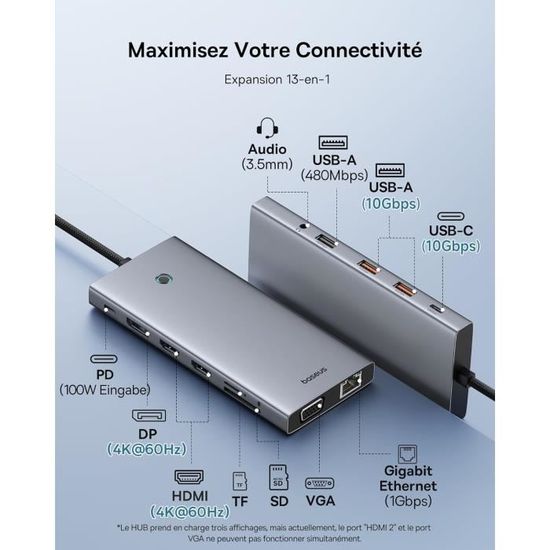 【Extension massive 10 en 1】 : équipé de 2 ports HDMI, 1 port de données USB-C, 3 ports USB-A, 1 port USB-C PD 100 W, 1 port Ethernet, 1 emplacement pour carte SD/TF, ce 10 La station d'accueil USB C en 1 offre une excellente connectivité pour satisfaire tous vos besoins d'extension à la fois, avec une efficacité beaucoup plus élevée au travail. 1 Transfert 10 Gbit/s 2 Alimentation PD 100 W 1 Verrouillage d'écran 2 Mini et compact 3 Conception haut de gamme L'appareil connecté (ordinateur portable, câble HDMI, écran) doit respecter le rapport de résolution recommandé pour ce produit. 1 Résolution d'affichage 2 Compatibilité étendue HUB USB type-c vers HDMI, Station d'accueil 4 ... – Grandado *Remarque : appuyez une fois si vous utilisez des systèmes Windows ou deux fois pour MacOS. Pourquoi la résolution ne correspond-elle pas à celle spécifiée ? Le rapport de résolution réel dépend du matériel de l'appareil connecté. 1 Image ultra 4k à 120 Hz 2 Double affichage efficace Stations D'accueil Pour Ordinateur Portable Charge Pd 100w Station D'Accueil USB-C Baseus 10-en-1 - 2 HDMI 4K@120Hz, Ports USB 10Gbps, Ethernet, Charge 100W - Pour MacBook Et PC USB-C Hub Station D'accueil Usb C Extension massive 10 en 1] : équipé de 2 ports HDMI, 1 port de données USB-C, 3 ports USB-A, 1 port USB-C PD 100 W, 1 port Ethernet, 1 emplacement pour... Vous pouvez accéder et transférer rapidement vos données importantes sans aucun délai. Plongez-vous dans une expérience visuelle vraiment remarquable qui captivera vos yeux. 【Double affichage avec clarté 4K à 120 Hz】 : vous pouvez choisir de diffuser votre écran en utilisant un port HDMI et profiter de la superbe clarté 4K à 120 Hz. 【Puissance PD 100 W】 : puissance d'entrée maximale de 100 W avec le port USB-C PD, vous pouvez profiter d'une charge à haute vitesse allant jusqu'à 85 W sur votre ordinateur portable, ce qui permet de le maintenir sous tension et prêt pour un travail efficace., chaque fois. Station d'accueil de Type C MST Multi Hub avec... – Grandado 【Transfert de données ultra rapide 】: vitesse de transmission de données jusqu'à 10 Gbit/s avec les 2 ports USB 3., 2 dont 1 port de données USB-C et 1 port de données USB-A, transférant vos gros fichiers et images en quelques secondes. Pourquoi n'y a-t-il que le mode miroir lors de la connexion de deux moniteurs ? Étant donné que macOS ne prend en charge que SST (Single-Stream Transport), ce HUB pour les utilisateurs de Mac OS ne prend en charge que le mode non miroir. C'est la limitation du système de Mac OS. Quelles sont les conditions requises pour utiliser ce produit ? Assurez-vous que le port Type-C de votre appareil dispose de toutes les fonctions (avec fonction de chargement, de transfert de données et de mode DP alt), sinon certaines fonctions (miroir ou extension d'écran) ne pourront pas être utilisées.