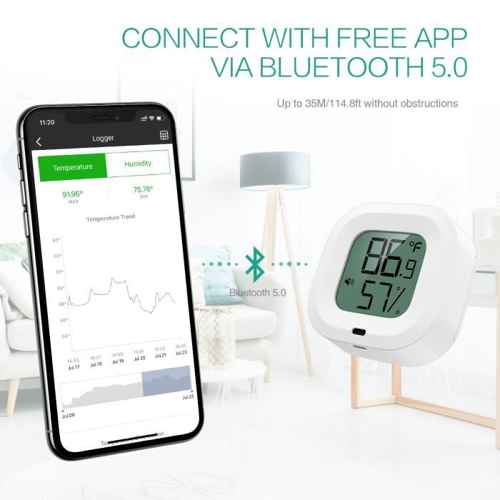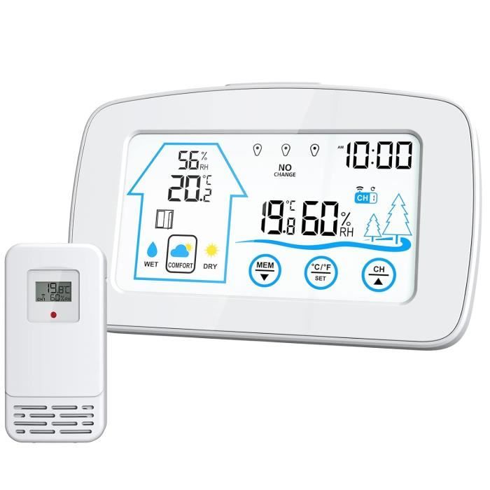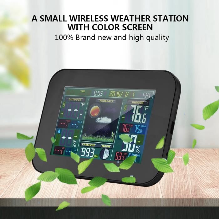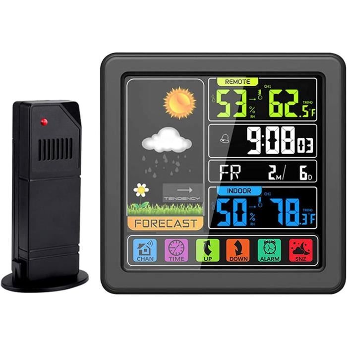 Station météo sans fil avec capteur extérieur Station météo sans fil thermomètre numérique L'appareil se déclenche lorsque la température dépasse la valeur définie, ce qui le rend idéal pour surveiller les réfrigérateurs et les congélateurs Station Meteo Interieur Exterieur Sans Fil, Station Météo Sans Fil Avec 3 Capteurs Extérieurs Thermometre Interieur Connecté Vous pouvez définir des alarmes de température maximale/minimale personnalisées. Cette station météo sans fil Oria mesure la température intérieure (32~140°F) et extérieure (-104°F~140°F) avec une précision de ±2℉. Elle affiche également l'humidité (10%~99%HR) avec une précision de ±5%HR. Distance de transmission jusqu'à 328ft, idéale pour un usage intérieur VEVOR Station Meteo Interieur Exterieur Sans Fil 7 en 1 Grand Ecran Couleur 7,5 po Station Meteo... Double Alimentation et Rétroéclairage: Le thermomètre peut être alimenté par 3 piles AAA (non fournies) ou par USB, tandis que le capteur est alimenté par 2 piles AAA (non fournies). Multifonctionnel: Ce thermomètre et hygromètre enregistre non seulement l'historique des températures maximales et minimales, mais dispose également d'une horloge, d'une alarme, d'une fonction snooze, d'un calendrier perpétuel, du changement d'heure et d'un rétroéclairage réglable. En mode batterie, le rétroéclairage s'allume automatiquement pendant 10 secondes, puis s'éteint automatiquement Il est équipé d'un capteur sans fil d'une portée allant jusqu'à 100 mètres (en espace ouvert) Il affiche également des icônes de confort intérieur et des recommandations vestimentaires pour un confort accru Écran Haute Résolution: Ce thermomètre-hygromètre numérique est doté d'un écran couleur haute résolution en verre VA, offrant un angle de vision plus large et un affichage plus net et plus lumineux que les écrans LCD standard.