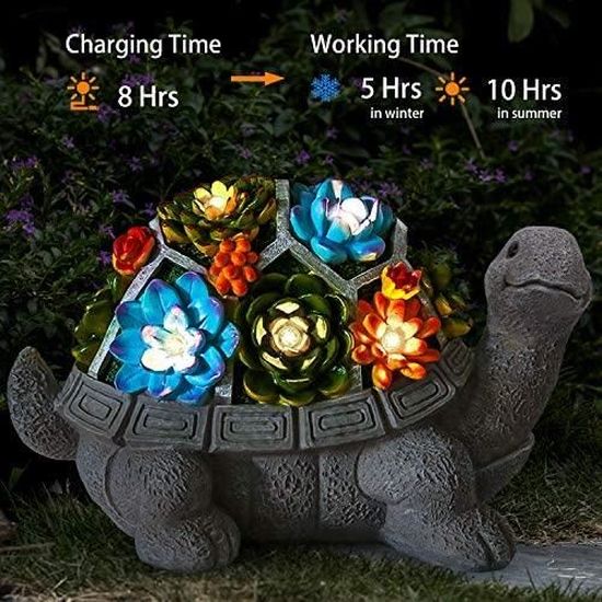 Décoration Extérieur Led Solaire Statue De Tortue D'extérieur Avec Plante Grasse Et 7 Lumières LED – Dé éclairage Solaire Décoratif Statue de tortue d'extérieur avec plante grasse et 7 lumières LED Statue de jardin solaire - Décoration d'extérieur - Tortue avec plantes grasses et 7 lumières LED pour terrasse, balcon, cour, pelouse, cadeaux d'anniversaire... Pas de câblage ni d'alimentation électrique externe, juste un éclairage écologique et sans effort pour votre espace extérieur. Facile à utiliser : il suffit d'allumer les lumières et de placer la décoration tortue au soleil pour la recharger complètement en 8 heures, puis de profiter de 8 à 10 heures de lumière LED brillante pendant la nuit. Remarque : avant utilisation, couvrez le panneau solaire pour voir s'il s'allume et vérifiez que l'interrupteur est en position marche. La lueur douce et chaleureuse met en valeur le savoir-faire artisanal et crée une ambiance de jardin confortable et accueillante. Décoration de jardin féérique : 19,5 x 11 x 12,5 cm. Cette ravissante statue de jardin apporte une touche de fantaisie, surprend vos invités et constitue un merveilleux ajout à votre jardin féérique. Idéale pour les balcons, les terrasses, les porches, les pelouses, les jardins ou tout autre espace. Décoration de jardin statues – Ornements de décoration de jardin...