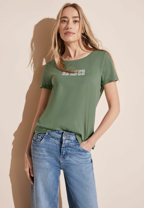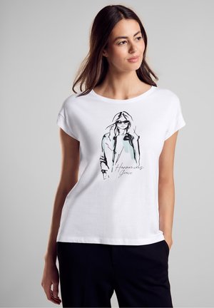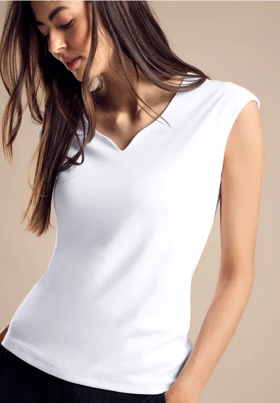T-Shirt mit Folienprint für Damen in Weiß Placeholder T-shirt Blanc Femme Street One T-shirt Avec Encolure En Forme De Cœur - Blanc (10000) - 34 T-shirt Femme Ce t-shirt basique de Street One pour femmes mise sur des détails féminins : le décolleté en forme de cœur apporte une touche de fantaisie, tandis que le devant doublé assure une qualité opaque. Le doux mélange coton-modal rend ce t-shirt à manches longues particulièrement agréable à porter STREET-ONE T-shirt avec ourlet élastiqué pour femmes en Bleu | STREET-ONE