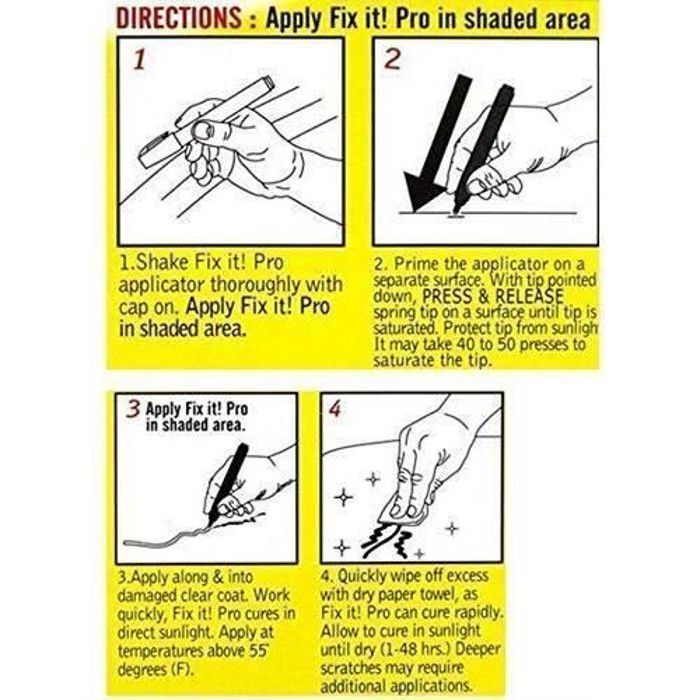 Le stylo anti rayure pour moto, voiture, vélo... FIX IT PRO... Usage doux & sûr : Action douce, ne abîme pas la surface de la carrosserie lors de l’utilisation. Universel (voiture, moto, vélo) : Stylo pro efface rayures compatible avec toutes les carrosseries, sans restriction de véhicule. Corrector Peinture Voiture Doux Chemin Stylo Anti-Rayures Recyclable, Stylo Pro Anti Rayure Pour Stylo Universel Véhicule Pour les rayures profondes, il est recommandé de faire appel à un professionnel., 3., Utiliser uniquement sur la peinture de carrosserie, et non sur les pièces en plastique ou en caoutchouc., 4., Ne pas utiliser par temps de pluie, par humidité 80 % ou par température inférieure à 10 °C, car cela pourrait affecter le résultat., 5., Les résultats de la réparation varient en fonction de la profondeur et de l'ancienneté de la rayure. C’est vraiment un efface-rayures très efficace pour le prix. Pour des rayures plus profondes, l’effet est atténué mais le stylo reste très utile. En termes de durabilité, le Fix It Pro se défend bien. J’ai lavé ma voiture à plusieurs reprises après application, et le produit n’a pas bougé 1., Après la première utilisation, laissez sécher complètement la surface, puis réappliquez si nécessaire pour un meilleur résultat., 2., Pour les rayures superficielles uniquement. Stylo Réparation Rayures Stylo Magique Anti-rayures T-Cut - Réparation Précise Pour Peinture Voiture Et Caravane Réparation Peinture Voiture