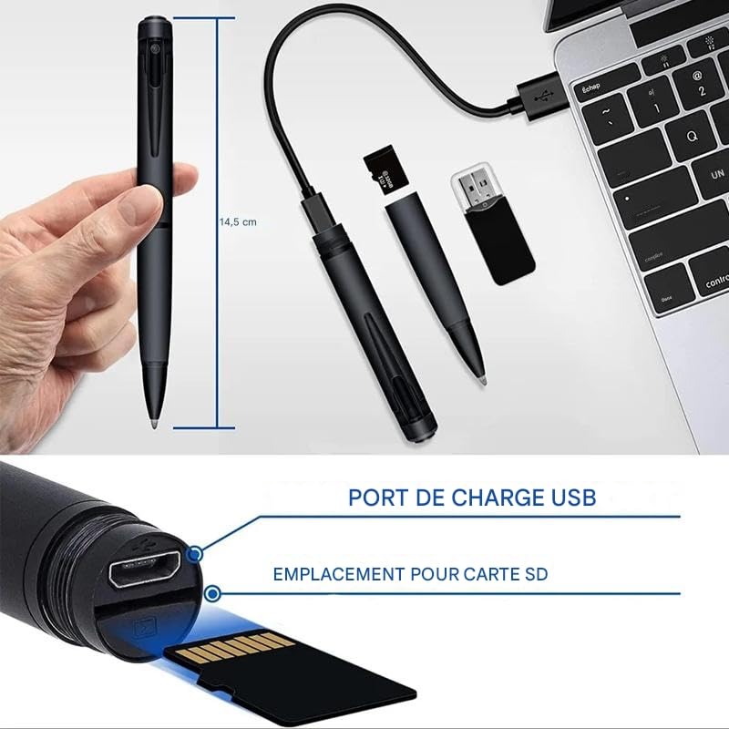 Stylo Caméra et Appareil photo Espion HD 8Go La batterie intégrée offre une autonomie suffisante pour vos besoins d'enregistrement quotidiens. Camera Espion Discrete Stylo Caméra Espion Haute-Définition Full HD 1080p Enregistreur Vidéo Stylo 32 Go HD Simple d'utilisation grâce à ses boutons de contrôle intuitifs, il combine fonctionnalité d'écriture et capacités d'enregistrement dans un format compact. Ce stylo caméra espion est équipé d'une caméra HD 720p miniature ainsi que d'un microphone. Noir et doré, il est à la fois élégant, très discret et performant. Ce stylo offre la possibilité de prendre des vidéos et photos de qualité avec une résolution vidéo 1280 x 720 pixels et photo de 2560 x 1440 pixels Stylo caméra espion et enregistreur vocal - Livraison Offerte... FONCTIONNEMENT SIMPLE: Boutons de contrôle facilement accessibles pour un démarrage rapide de l'enregistrement Livré avec tous les accessoires nécessaires pour commencer à l'utiliser immédiatement. ACCESSOIRES INCLUS: Livré avec câble de recharge, recharges d'encre supplémentaires et lecteur de carte pour transfert de données Le kit comprend cinq recharges d'encre supplémentaires, un lecteur de carte USB et tous les accessoires nécessaires pour une utilisation immédiate. CAMÉRA HD: Équipé d'une caméra haute définition discrètement intégrée dans un stylo élégant pour des enregistrements vidéo de qualité Son design noir professionnel ressemble à un stylo ordinaire, parfait pour la capture vidéo discrète.