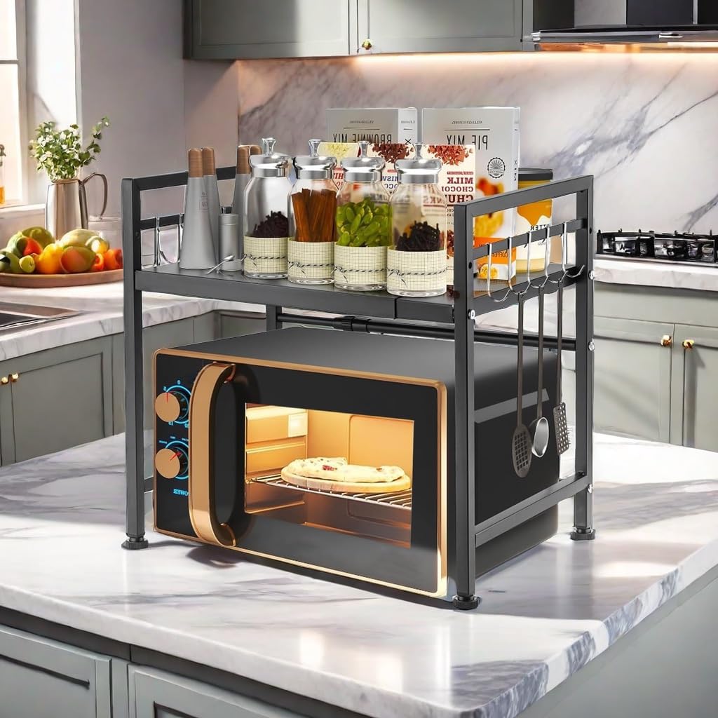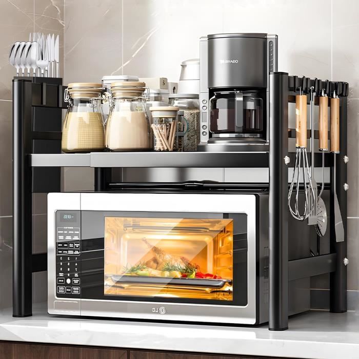 Spécifications: Matériau : acier au carbone Couleur : noir. Support Micro-ondes Avec Crochets Support Micro-ondes Extensible AUAURAINTT - 2 Niveaux, 6 Crochets, Ajustable 40-64cm | Rangement Cuisine Noir étagère Micro Onde à Poser Sur Plan De Travail Etagere Micro Onde Extensible L'entretien est tout aussi simple : un chiffon humide suffit pour garder l'étagère propre. Les quatre pieds antidérapants réglables garantissent une stabilité supplémentaire et protègent vos surfaces des rayures. Montage facile : grâce aux outils fournis et aux instructions claires (français non garanti), l'étagère se monte en un tour de main. Elle est parfaite pour une variété de pièces et de fins, comme le salon, la salle à manger, la terrasse ou le bureau. Ripiano Salvaspazio Cucina Auauraintt - Support Étagère Micro-Ondes 2 Niveaux Extensible (40-64cm) - 6 Crochets Inclus - Gain De Place Cuisine - Noir étagère Micro Onde Gain de place : avec crochets et 2 niveaux pour plus d'espace de rangement. Longueur : 44-60 cm Largeur : 32 cm Hauteur : 80 cm. Polyvalent : convient non seulement pour la cuisine, mais aussi pour d'autres pièces. Plus d'espace et d'ordre : avec son design à 3 niveaux et ses 8 crochets amovibles, notre étagère offre beaucoup d'espace en hauteur et vous permet d'accrocher des ustensiles de cuisine tels que des cuillères, des chiffons et des gants. Utilisez-la comme bibliothèque, support pour plantes ou pour placer votre fax et d'autres articles de bureau. Étagère Micro Ondes 2 Niveaux, Support Four Micro Onde Extensible Noir... ZLPBAO Support de Four à icro-Ondes Extensible avec 6 Crochets, Grille... Robuste et stable : fabriquée en acier robuste, antirouille et avec des pieds antidérapants sécurisés. Facile à installer et à nettoyer : installation rapide et nettoyage facile. 1 manuel d'utilisation (français non garanti). JNGLGO Étagère extensible pour micro-ondes avec crochets Flexible : longueur réglable entre 44 et 60 cm.
