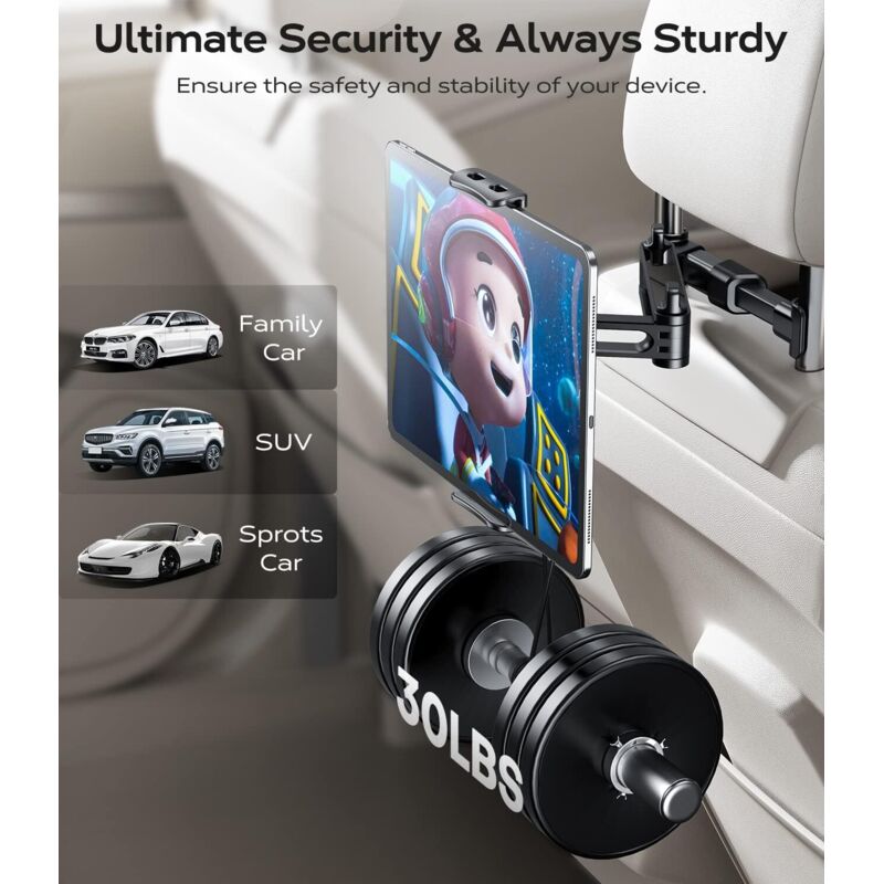 Porte Tablette Voiture Support Tablette Voiture Appuie Tête Support Tablette Voiture - Fixation Universelle Pour Appuie-tête, Rotation 360°, Extensible 26cm Tablette Voiture Enfant Support Appuie-tête Arrière Support de tablette de voiture, Supports pour voiture universel 99 % pour iPad, siège YONGQING Support de tablette pour appuie-tête de voiture, rotation à... 【Installation et utilisation sans effort】Notre support de siège arrière de voiture est conçu pour une installation et une utilisation faciles. Convient aux poteaux métalliques d'appuie-tête compris entre 13 et 16,5 cm, assurant un ajustement parfait pour la plupart des véhicules. Adaptez la position de votre tablette selon votre confort, offrant une expérience de visualisation optimale pendant votre voyage. Spécifications Couleur : noir Dimensions : Min : 4,4 pouces et Max : 7,8 pouces Contenu de l'emballage 1 support de siège de voiture Cela garantit une prise ferme sur votre siège arrière et votre appareil, offrant une plate-forme stable pour la visualisation. Qu'il s'agisse d'iPad Pro, iPad Air, iPad mini, Galaxy Tab, Pixel C, Nexus, Tab E 4, Switch ou tout autre smartphone, notre support est là pour vous. 【Hub de divertissement pour siège arrière】 Transformez le siège arrière de votre voiture en zone de divertissement avec notre support de montage. Les Meilleurs Supports De Tablette Pour Voiture. Comparatif & Guide D...
