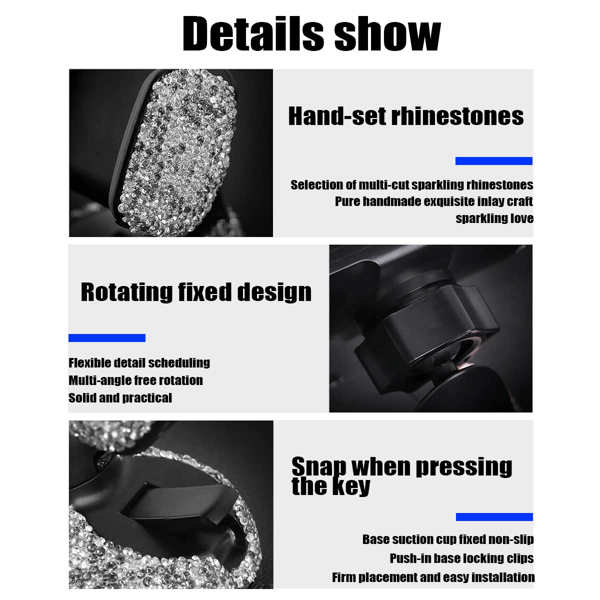 JNNJ Support Téléphone Auto Bling Bling, Support De Téléphone Cadeau Parfait]: Ce magnifique accessoire de voiture scintillant, magnifiquement fabriqué avec des diamants, avec des strass bling bling, non seulement ajoute de l'éclat à votre véhicule, mais peut également être le cadeau parfait pour la famille et les amis Support Voiture Telephone CGEAMDY Bling Bling Support Telephone Voiture, Glitter Diamant Support Clip Bouche D'aération Inclus - Diamètre : 13cm*10cm*1., 8cm - Couleur : Blanc, Rouge, AB Rose , Noir, Bleu, Rose - Véhicules compatibles : Universel - Poids:153g - Matière : Strass - Montage : Type d'aspiration magnétique Caractéristiques : - Incrusté à la main de diamants pour une voiture élégante et magnifique. 【Installation Rapide】: Les ventouses sur le fond facilitent la fixation et le retrait sans outils. Réglable. Garantit une conduite sûre : le support de téléphone portable de voiture est rembourré et de larges ailes de préhension protègent votre téléphone... - Facile à installer et à retirer, il peut également être monté sur le pare-brise. Appuyez sur les deux boutons PUSH pour changer l'orientation et le fixer également sur les bouches d'aération. 【Cadeau Parfait】: Ce magnifique accessoire de voiture scintillant, magnifiquement fabriqué avec des diamants, avec des strass bling bling, non seulement ajoute de l'éclat à votre véhicule, mais peut également être le cadeau parfait pour la famille et les amis. Durable et difficile à enlever, il suffit de le rincer à l'eau tiède et de le laisser sécher à l'air libre pour qu'il retrouve son état collant.