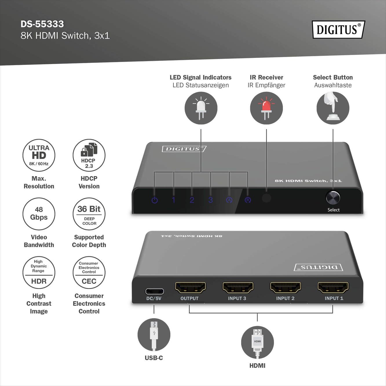 DIGITUS DS-55334 Commutateur HDMI 5x1-5 in 1 Out - UHD 8K/60 Hz HDTV : 7680 × 4320p - HDCP 2.3 & HDMI 2.1 - HDR, CEC, Deep Color, DTS, Dolby Digital, LPCM - pour TV, Moniteur, PS5, PS4, Xbox : : Jeux vidéoLes prix des articles vendus sur incluent la TVA. En fonction de votre adresse de livraison, la TVA peut varier au moment du paiement. Pour plus d'informations, Veuillez... SONORE : les formats audio pris en charge, tels que DTS, Dolby Digital & LPCM, garantissent un son excellent et permettent de vivre une expérience de home cinéma inoubliable avec le mélangeur HDMI ÉCONOMIQUE : avec une faible consommation d'énergie d'environ 5 W seulement, le répartiteur HDMI 5-en-1-out peut être facilement alimenté directement par un téléviseur ou un chargeur USB via un câble USB (inclus). Compatible PS5 Xbox HDCP 2.3 DIGITUS 4K HDMI Switch, 5x1 , Ultra HD Mit 60 Hz, Full 3D, HDCP 2.2, HDMI 2.0, Aluminium Gehäuse Schwarz Commutateur Vidéo HDR HAUTE DEFINITION : Le commutateur HDMI supporte des résolutions jusqu'à 8K@60Hz et est rétrocompatible avec HDMI 2., 0 - High Dynamic Range (HDR) et Deep Color (36 bits) offrent des couleurs vives et impressionnantes Le DIGITUS DS-55334 est un câble USB-C multifonctionnel conçu pour une connectivité transparente dans votre configuration audio et vidéo. D'une longueur de 1 m, ce câble fournit une entrée et une sortie HDMI tout en étant doté d'une entrée USB-C, ce qui le rend polyvalent pour divers appareils SIMPLE : le changement de signal d'entrée sur le commutateur vidéo s'effectue facilement à l'aide de la télécommande IR (piles non comprises), de la touche de fonction du commutateur HDMI ou par détection automatique du signal. DIGITUS DS-55123 4K HDMI IP EMPFÄNGER 4K HDMI Extender CAT Empänger