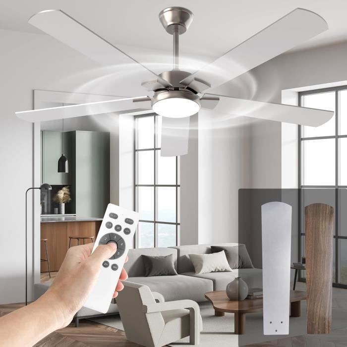 TECHBREY Ventilateur de Plafond LED Triffin Blanc 107cm Moteur DC Hauteur du ventilateur : avec éclairage (17 cm) Diamètre du ventilateur : 107 cm Matériau des pales : plastique ABS * 3 Matériau du corps principal : fer (peinture en aérosol) Couleurs disponibles : noir, blanc. Tension d'entrée : 100-260 V 50/60 Hz Puissance du moteur : 45 W Puissance lumineuse : 24 W Contrôle : Télécommande Vitesse : 180 tr/min Type de moteur : Moteur CC 30 W max... Ventilateur Télécommande 107cm Ventilateur De Plafond De 107 Cm Avec éclairage, Télécommande, 6 Vitesses Et Moteur Cc Réversible Lustre Ventilateur De Plafond Esthétique et confort en un : Ce ventilateur de plafond avec lumière combine fonction de rafraîchissement et d’éclairage, apportant une touche élégante à votre maison. Ventilateur et lumière peuvent être allumés séparément TechBrey Ventilateur Exterieur Silencieux Navy 107cm Moteur DC, Avec... Adapté pour les intérieurs (salon, chambre, bureau) et les extérieurs (terrasse, pergola) (attention à éviter l'exposition directe à la pluie) Le volume en fonctionnement est bas, jusqu'à 35 dB, parfait pour les familles avec bébés ou seniors De plus, un support technique 24h est disponible —— n'hésitez pas à nous contacter si vous rencontrez des problèmes lors de l'utilisation ou de l'installation Installation facile : Nous fournissons des instructions d'installation détaillées et une vidéo tutorielle.