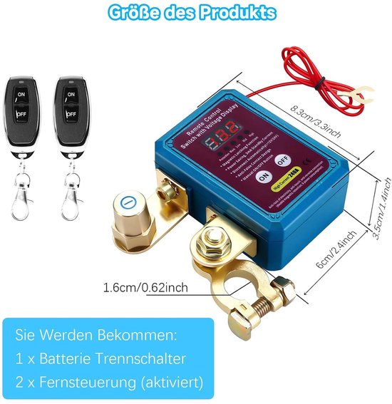 Que vous ayez besoin d'entretenir ou de ranger votre voiture, vous pouvez facilement la contrôler de l'extérieur. Vous pouvez donc activer ou désactiver la batterie et ne pas avoir à jouer sous le capot. Il peut donc être utilisé dans la plupart des voitures, camionnettes ou véhicules agricoles. 【Interrupteur de déconnexion de batterie de voiture à distance】: L'interrupteur de déconnexion de batterie à distance vous permet de contrôler facilement et commodément la batterie de votre voiture avec une distance allant jusqu'à 160 pieds / 48,78 m. Antivol Batterie 12V Interrupteur Batterie Voiture 12V 500A Avec 【Pratique et facile】 : Notre interrupteur de batterie électromagnétique vous permet de déplacer la gâchette de sous le capot vers votre main. 3 : Lors de la commande de l'interrupteur marche-arrêt du pôle négatif, il y a une grande pince avec le pôle négatif connecté à la batterie, et grand clip est connecté au pôle négatif de la batterie (le pôle positif est également le même). TERMINAL D'INTERRUPTEUR DE coupure de batterie moto pour amélioration... 【Faible consommation d'énergie】 : l'interrupteur de coupure de batterie ne consomme que 5 mA en mode veille et environ 3 W en fonctionnement, vous pouvez donc être sûr qu'il ne consommera pas beaucoup d'énergie de votre batterie. 2 : Les deux grandes bornes de l'interrupteur à relais constituent l'interrupteur principal. 【Tension de fonctionnement】 : l'interrupteur de coupure de batterie à distance fonctionne à la tension de fonctionnement de 12 V, adaptée à la plage de 11 à 15 V. Avec Télécommande 2 Pièces Interrupteur De Coupure De Télécommande Sans Fil DC12V 200A Relais De Coupe Circuit Batterie 12v Comparez et évaluez les 10 meilleurs Coupe Batterie Voiture Avec Télécommande pour 2025 sur . Découvrez les options les mieux notées avec des analyses détaillées pour vous aider à faire le meilleur choix Cependant, il est important de noter que cet interrupteur ne sert qu'à allumer et éteindre la batterie et non à la fonction de démarrage.