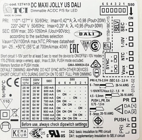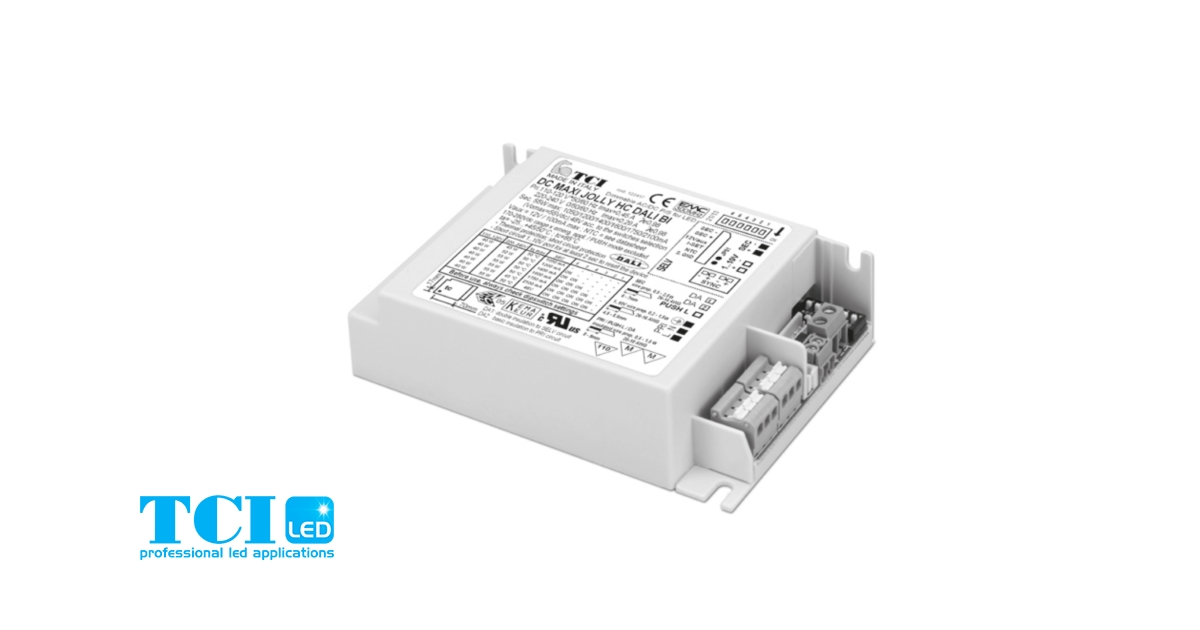 8 mm (DC MAXI JOLLY US DALI). Alimentation Pour éclairage Intérieur TCI125464 DC Maxi Jolly US Dali BI Direct Current Dimmable Electronic LED Driver With DIP-SWITCH Alimentation Led Dali 2 Tension nominale : 110., ., ., 127V 220., ., ., 240 V Dimming: DALI-2 (également DALI-1) 1-10 V - 0-10 V. Bloc d'alimentation multipuissance fourni avec dip-switch pour la sélection du courant de sortie. Bloc d'alimentation indépendant IP20 pour usage intérieur. Alimentation à incorporer (DC MAXI JOLLY US BI DALI). Utilisable pour les appareils d'éclairage de classe de protection I et II. PFC actif Alimentation à incorporer (DC MAXI JOLLY US BI DALI). Sortie auxiliaire 12V max. TCI DC MAXI JOLLY US DALI fuente de alimentación para lámparas LED 127413 Bloc d'alimentation indépendant IP20 pour usage intérieur output EXTERNAL NTC INPUT Suitable for AUTOMATIC WIRING MACHINE Approvals : KEMAKEUR ENEC UL (other than Class 2) RCM CE EAC UKCA Bornes d'entrée et de sortie du même côté (section câble jusqu'à 2,5 mm2 / AWG13). TCI dC maxi jolly hC dALI 0-55W/2 Bloc d'alimentation multipuissance fourni avec dip-switch pour la sélection du courant de sortie. Serre-câble sur primaire et secondaire pour câbles de diamètre : min., 3 mm - max.